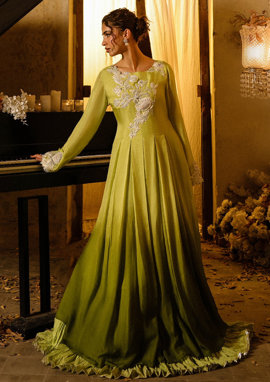 An ode to timeless grandeur — this long, flowy box-pleated dress is delicately embroidered with...