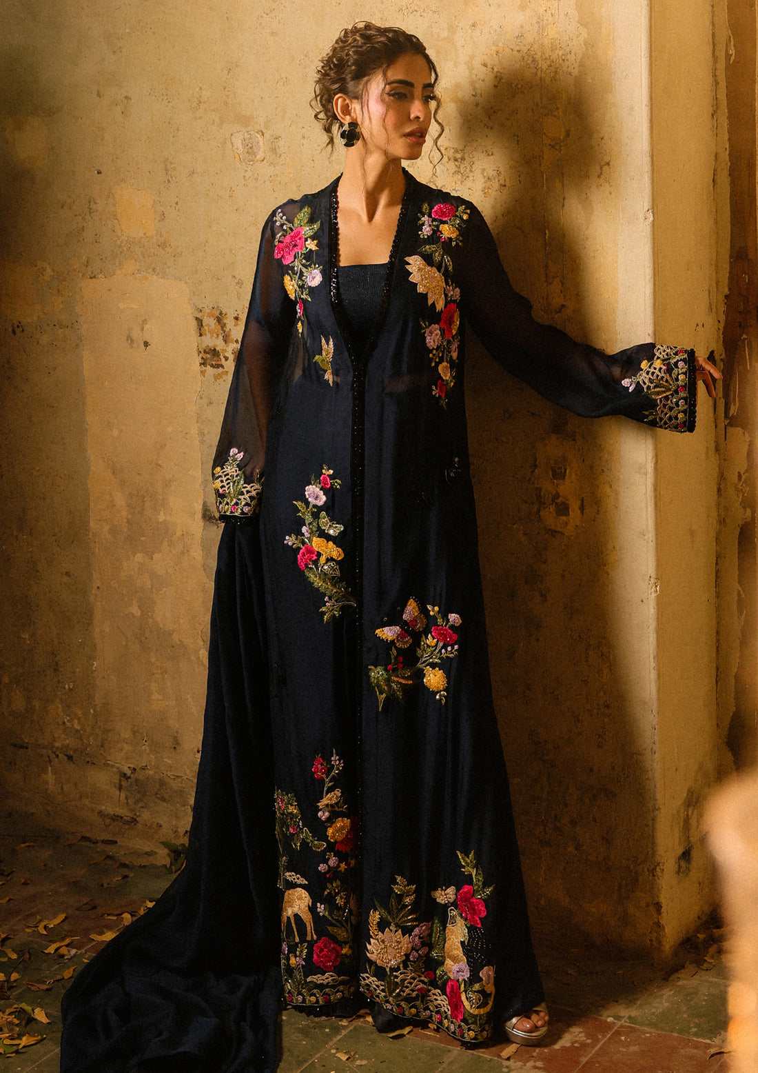This ensemble features a long-length, front-open jacket adorned with multicolor embroidery, further embellished with sequins,...