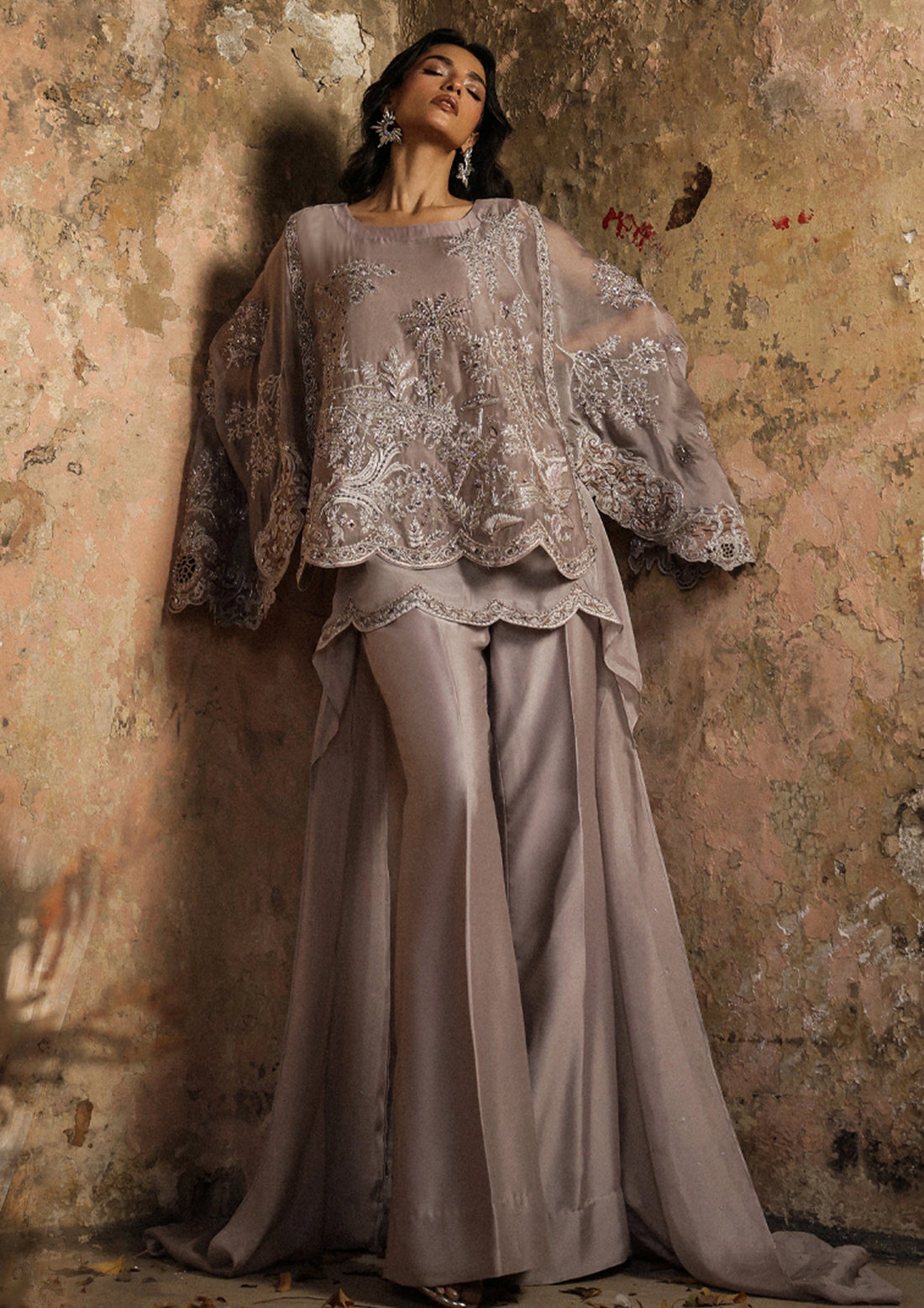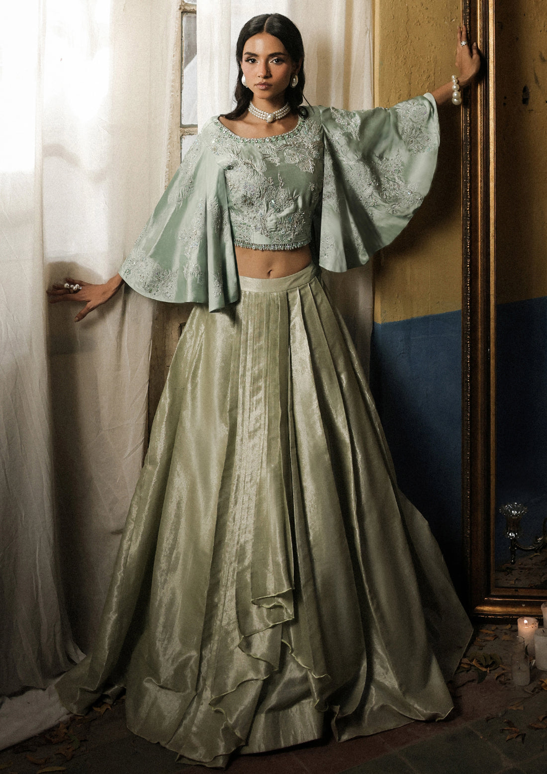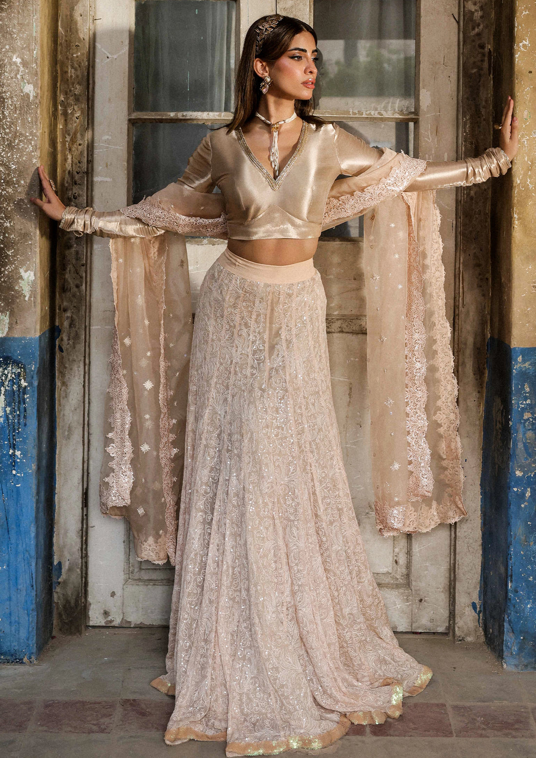 This ensemble pairs a refined blouse with voluminous flared sleeves, embellished with threadwork, pearls, sequins,...