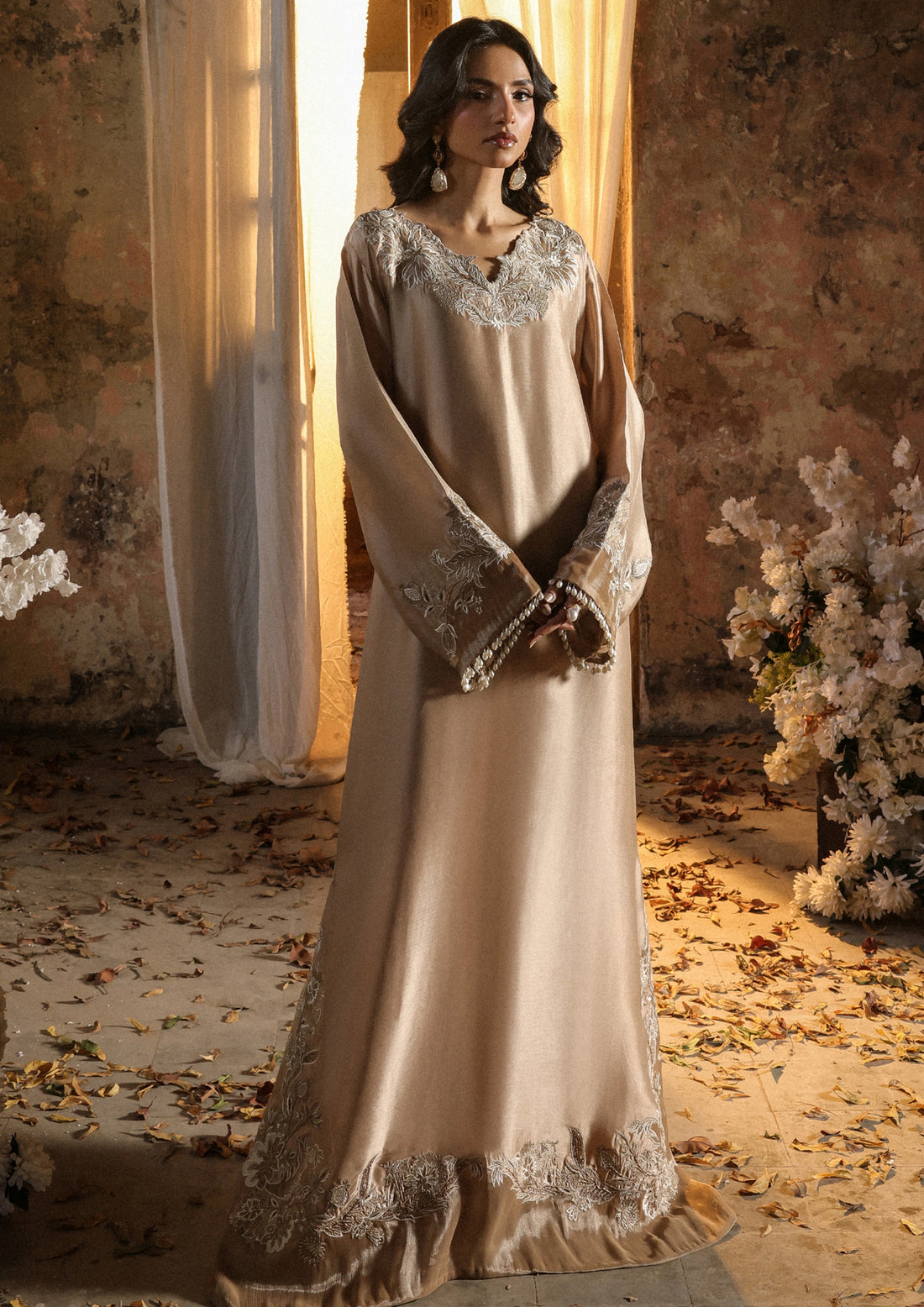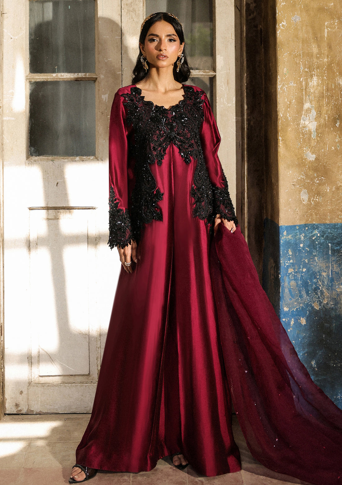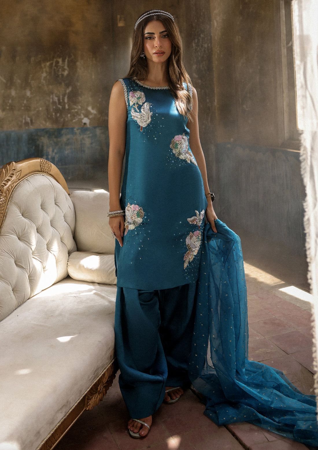 This ensemble pairs a refined blouse with voluminous flared sleeves, embellished with threadwork, pearls, sequins,...