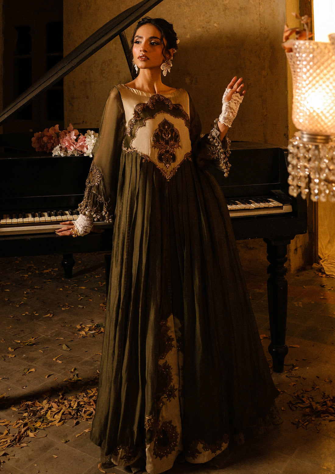 A silhouette of grandeur — this flared front-open dress is delicately adorned with intricate embroidery,...