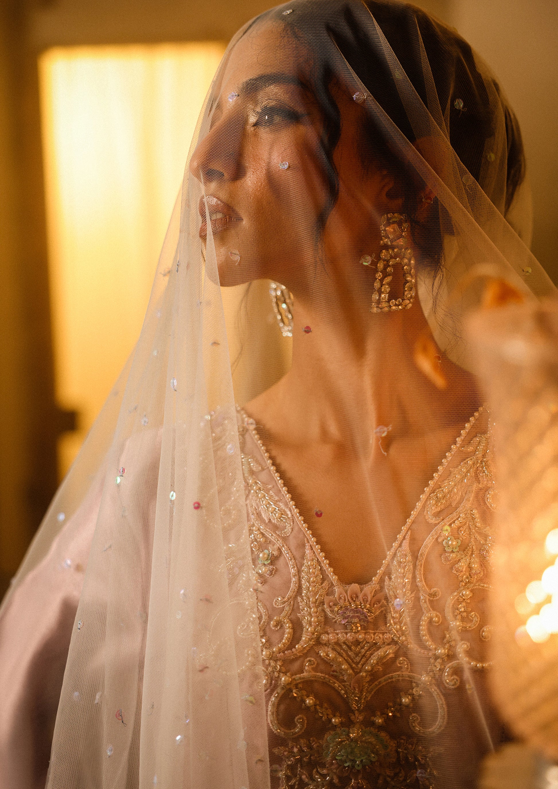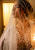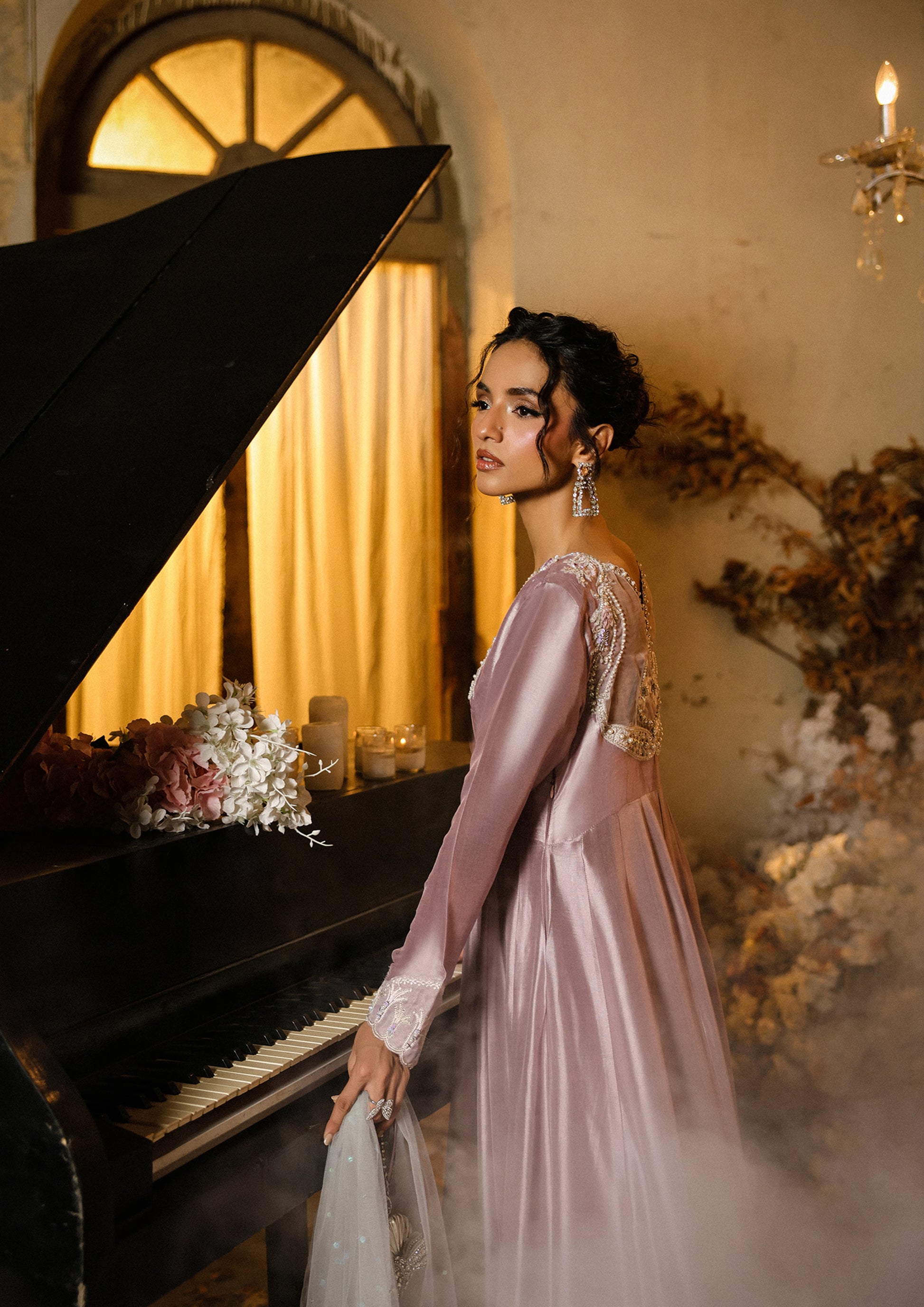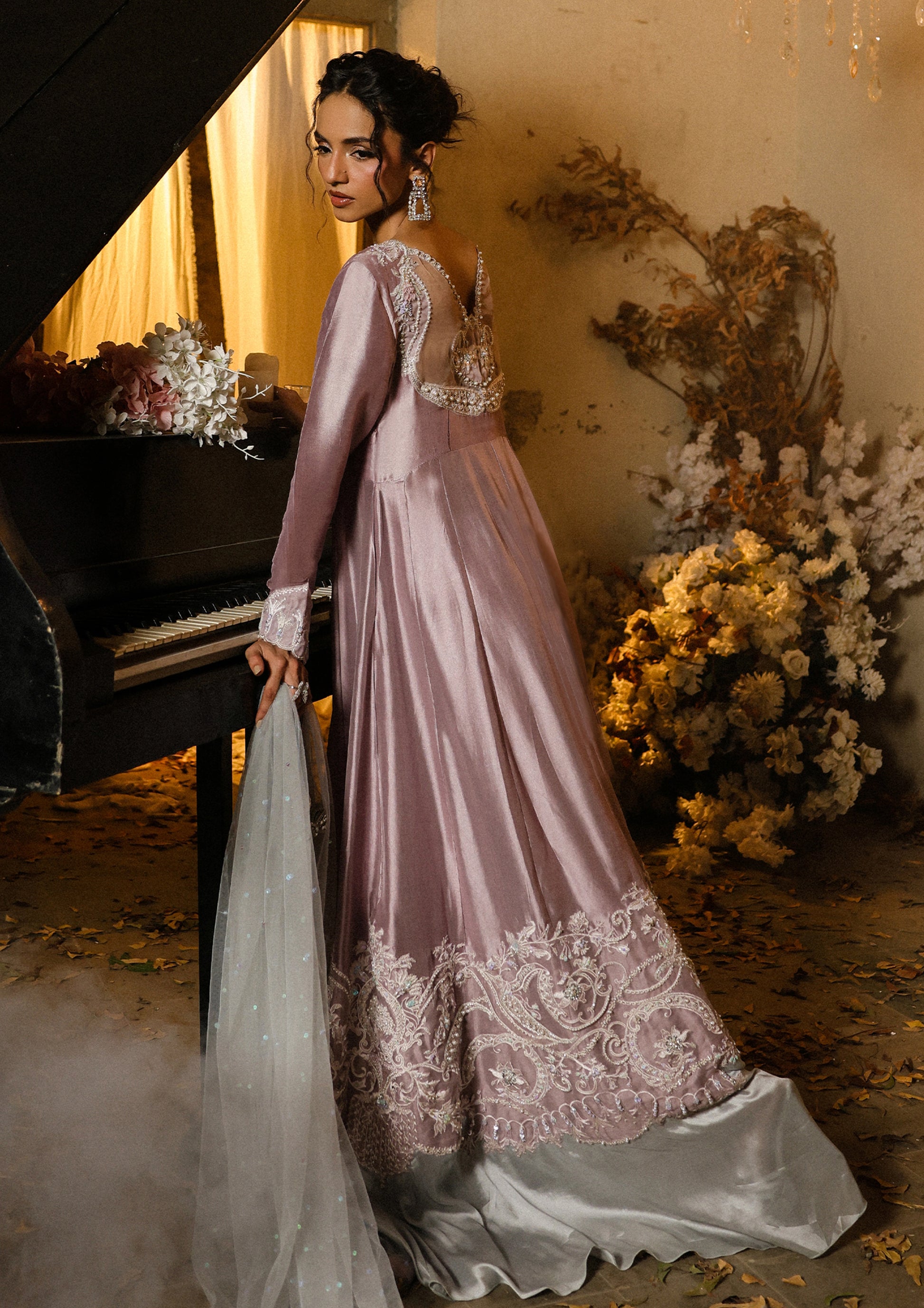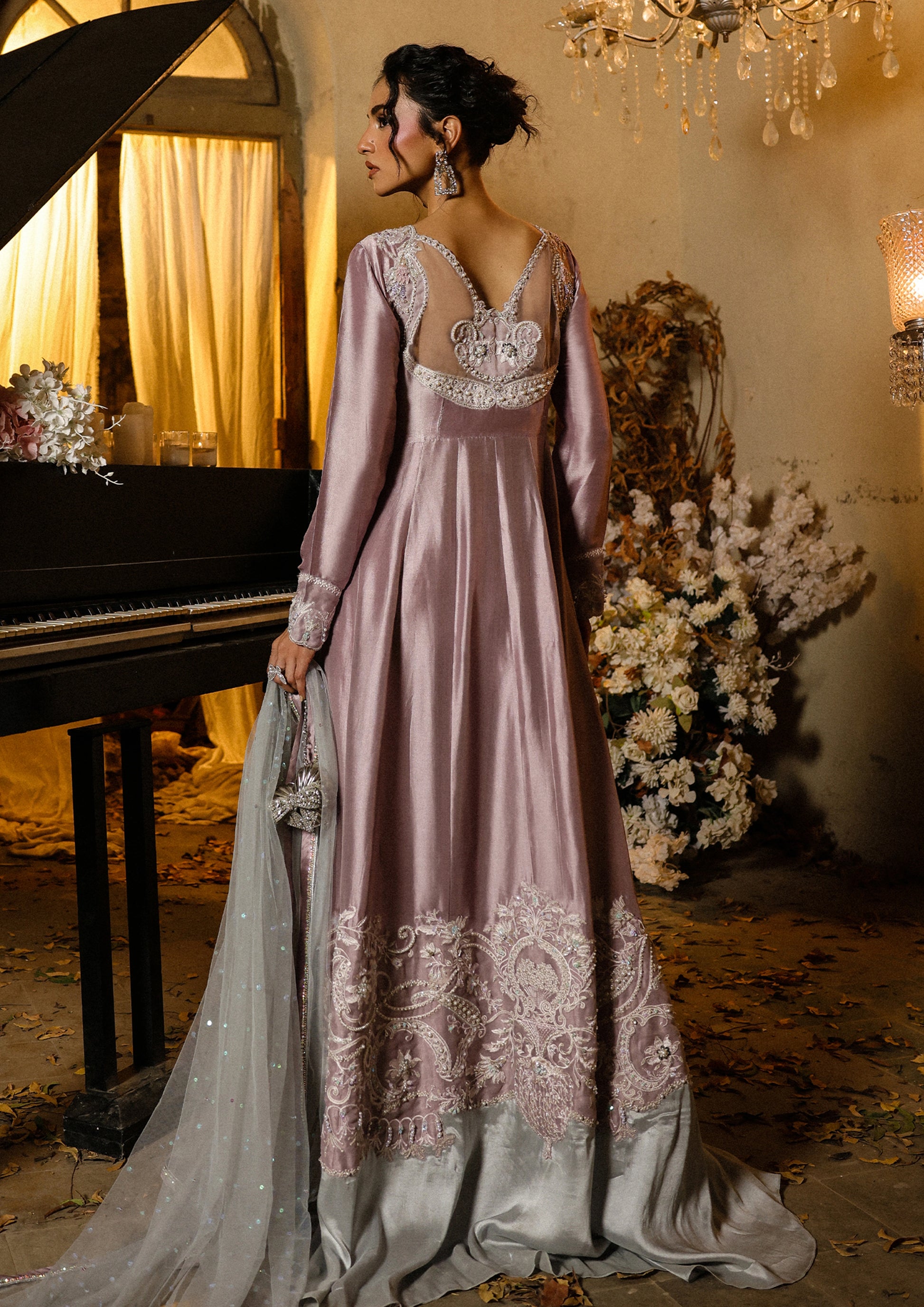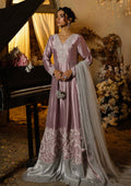 This lilac kalidar frock is tailored with meticulous detailing, featuring embroidery along the hemline and neckline with cutwork accents. The design is further enhanced with crystals, beads, diamonties, and zardozi work. It is paired with cigarette pants and a net dupatta embellished with fine detailing, creating a refined and graceful three-piece look.
