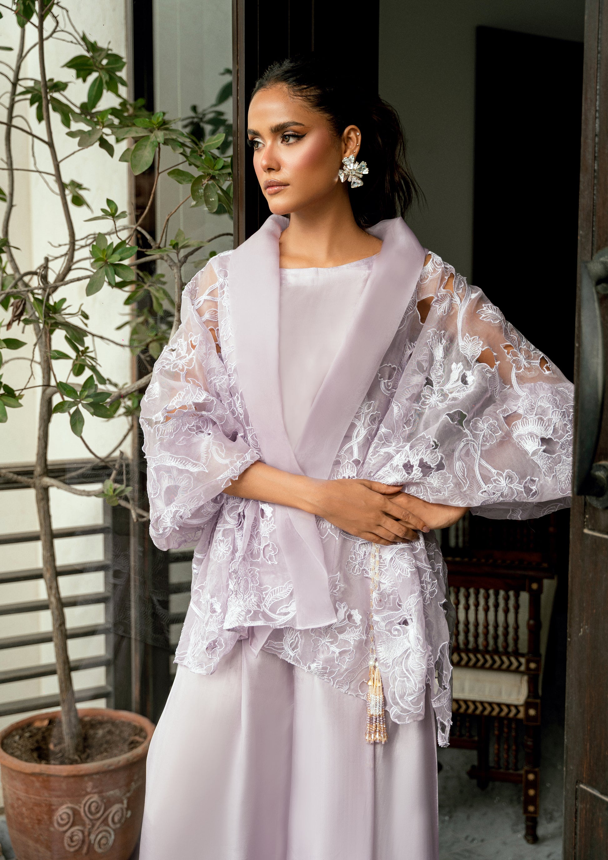 A soft yet striking statement ensemble, Lavelle is a contemporary crafted in a dreamy lavender tone. The short-length, wrap-around cape features bold floral cutwork embroidery, intricately highlighted with pearls and sequins for a luminous finish. The structured silhouette flows effortlessly, balancing softness with strength.