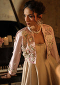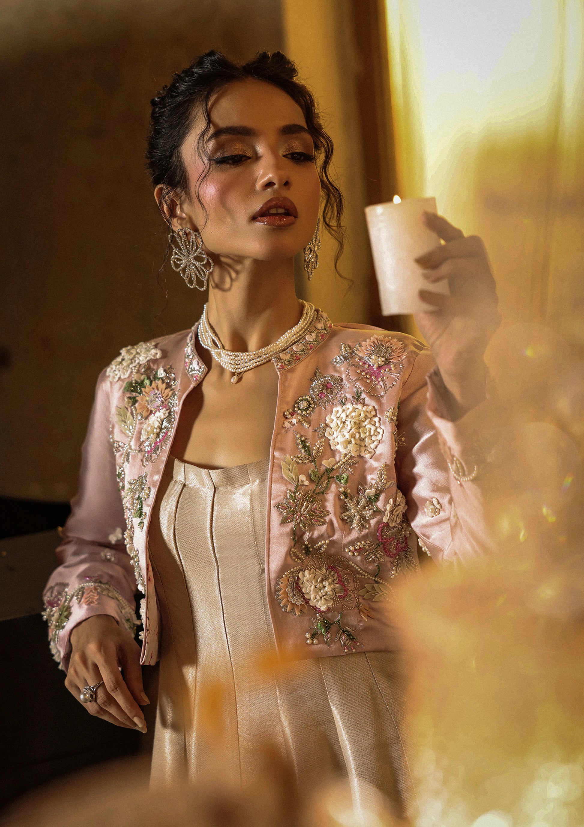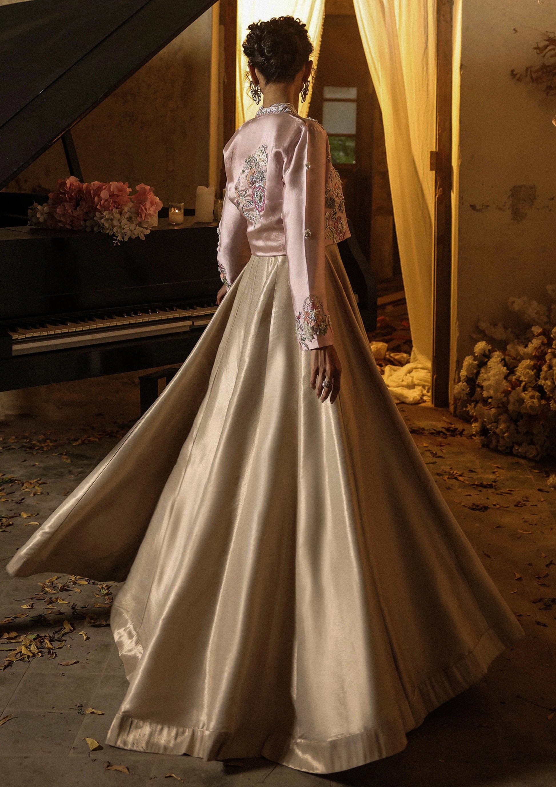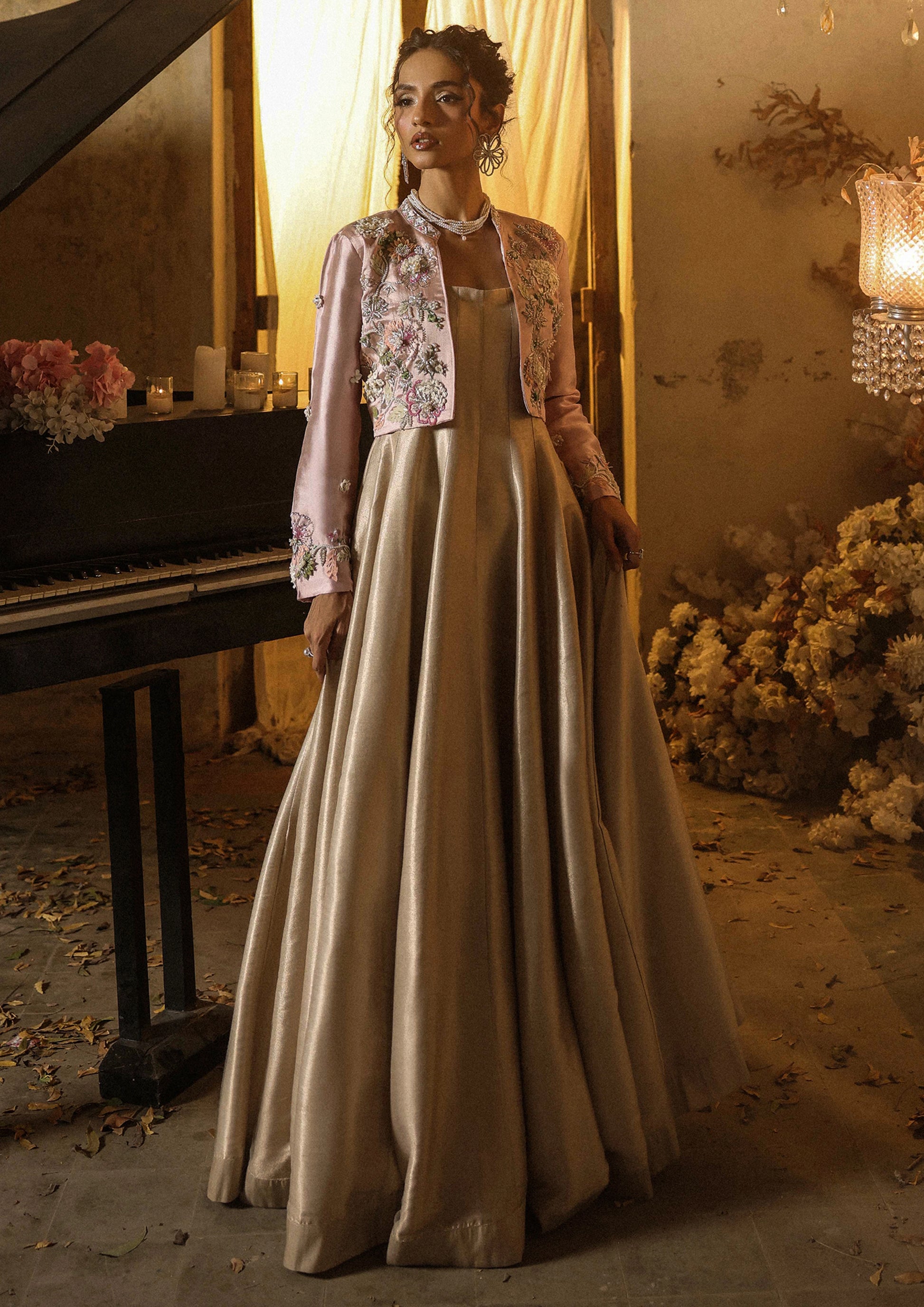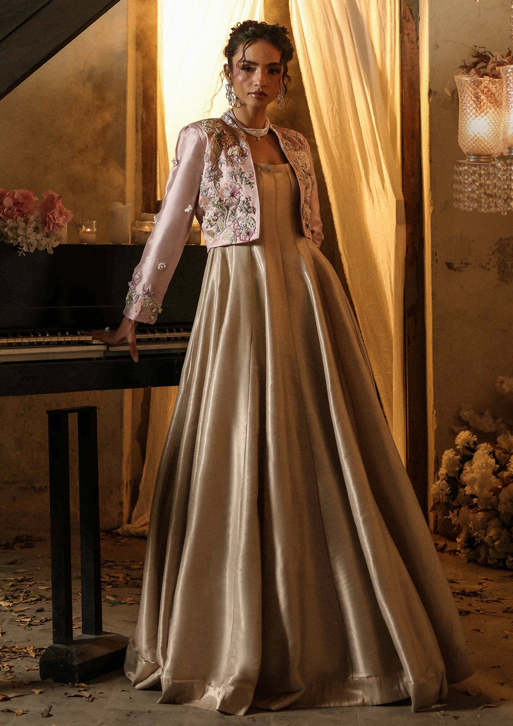 This ensemble features a hand-embroidered and embellished crop jacket layered over a paneled Maysori dress. The jacket’s intricate detailing adds structure and sparkle, while the flowing silhouette of the dress creates a balanced, elegant look. Designed to radiate sophistication, the outfit carries a graceful vibe reminiscent of Isabella-inspired charm.