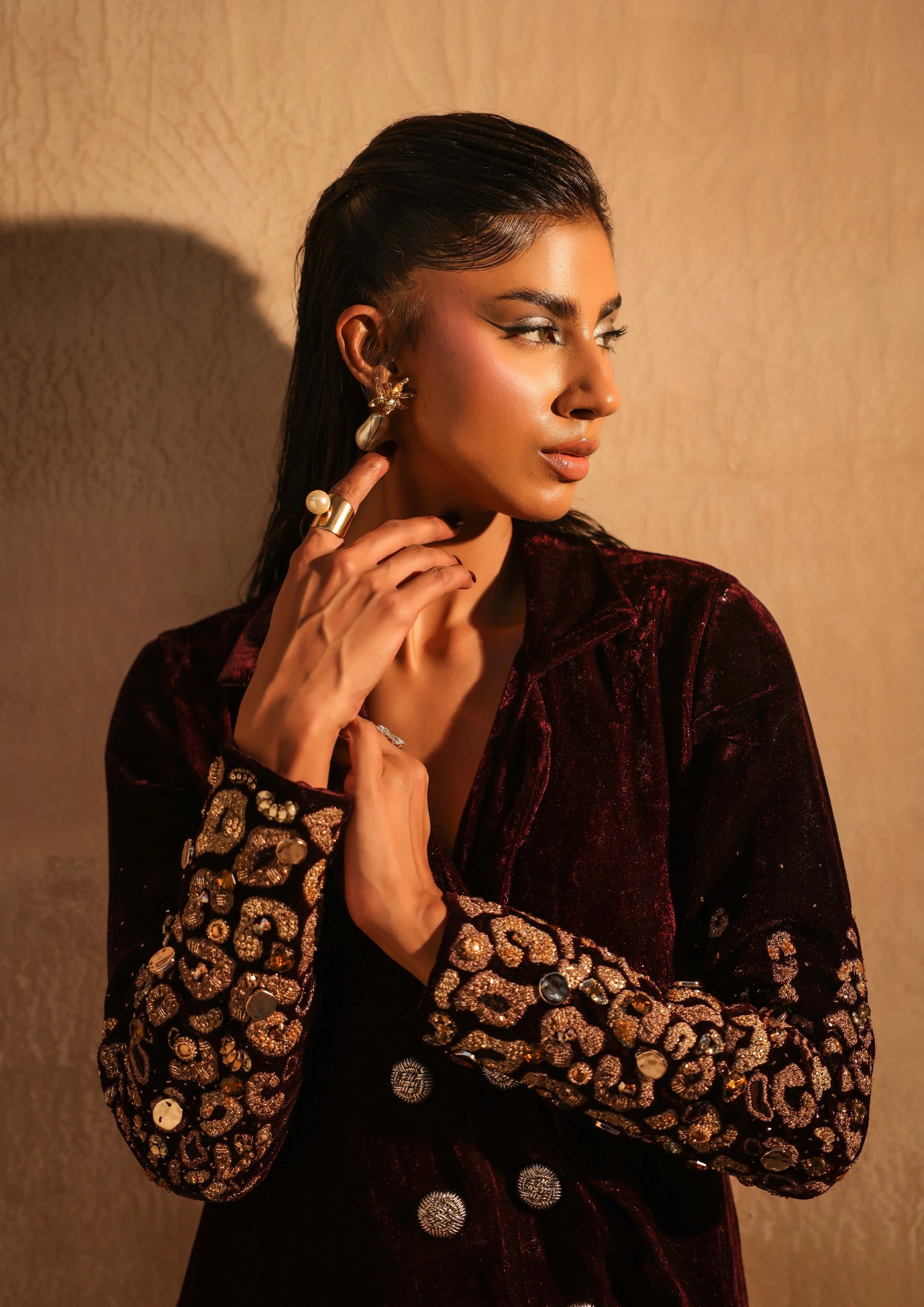 Every detail speaks of strength and statement design—where traditional power dressing meets untamed glamour. This Spencer coat stands as one of the boldest expressions of the Cleopatree’ collection, embodying dominance, elegance, and fearless individuality.