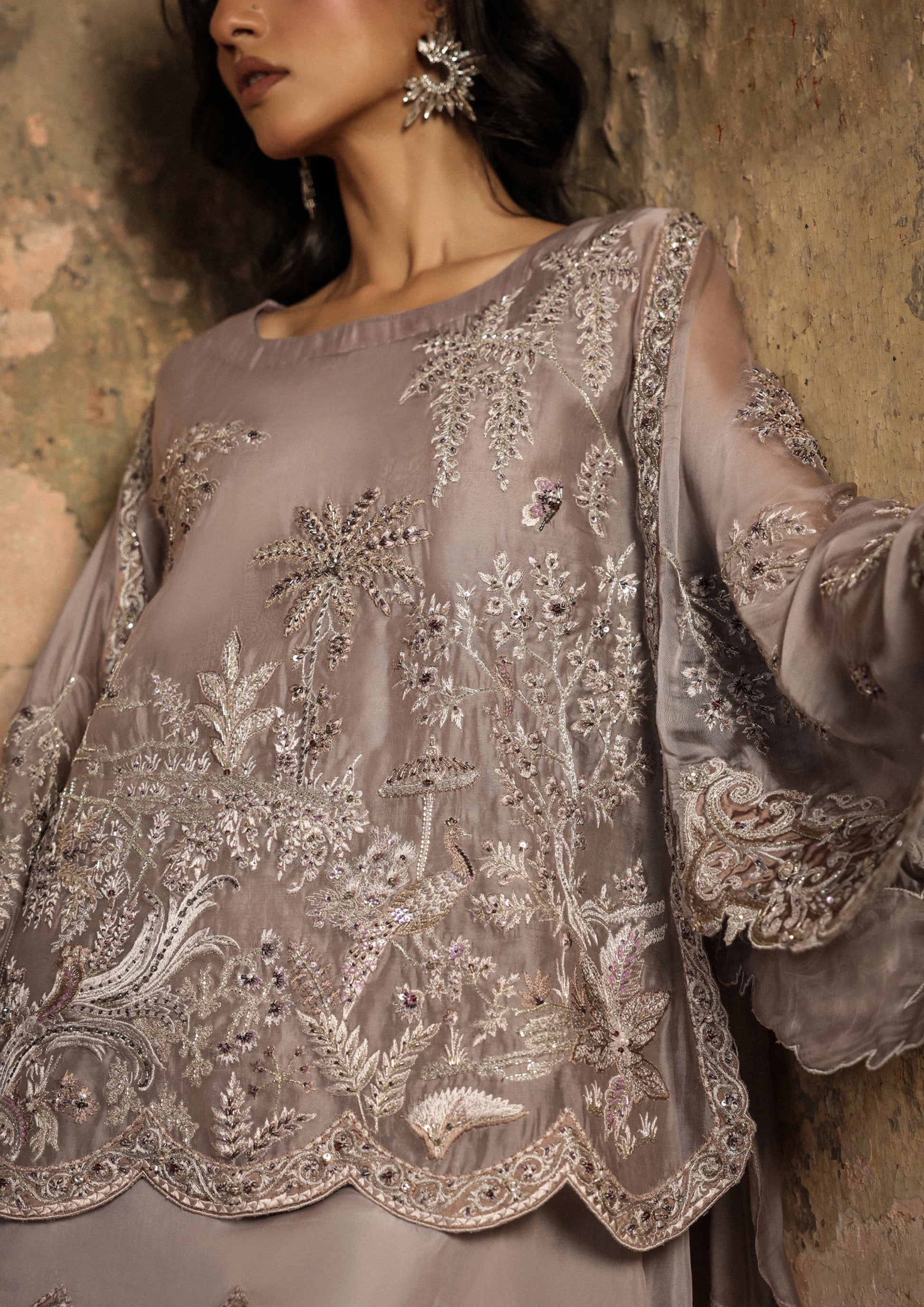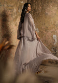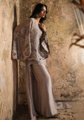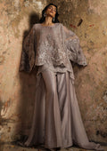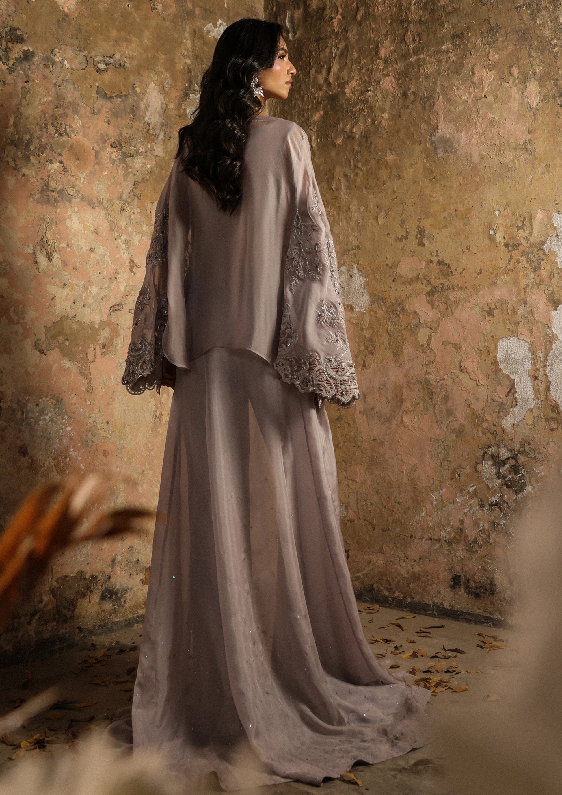 This ensemble is crafted in a double-layer style. The upper jacket is designed with flowy sleeves, while the inner dress features a high-low cut and a pleated back with tail for added dimension. The look is completed with bell-bottom silk pants, offering a refined balance of contemporary and classic styling.