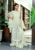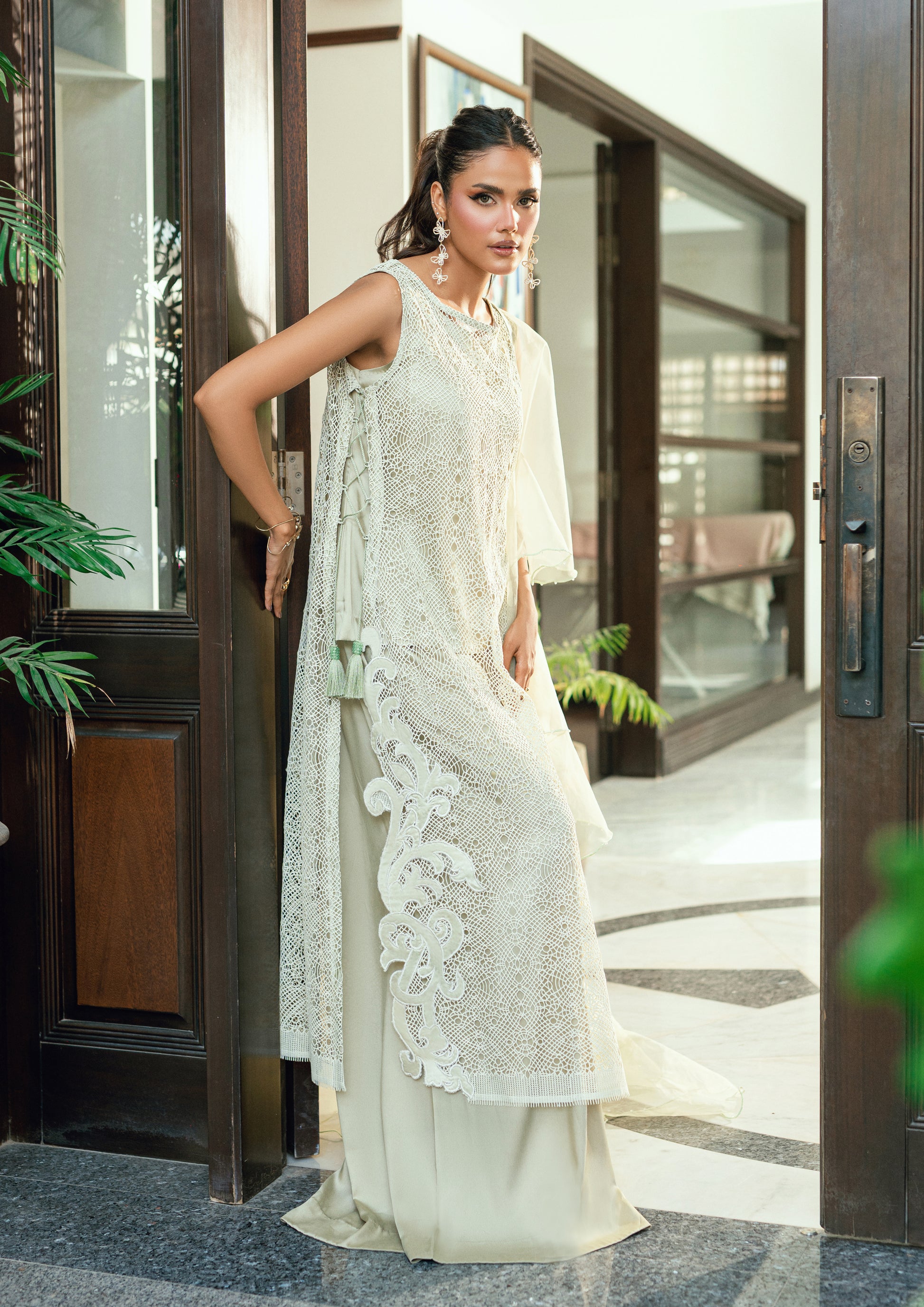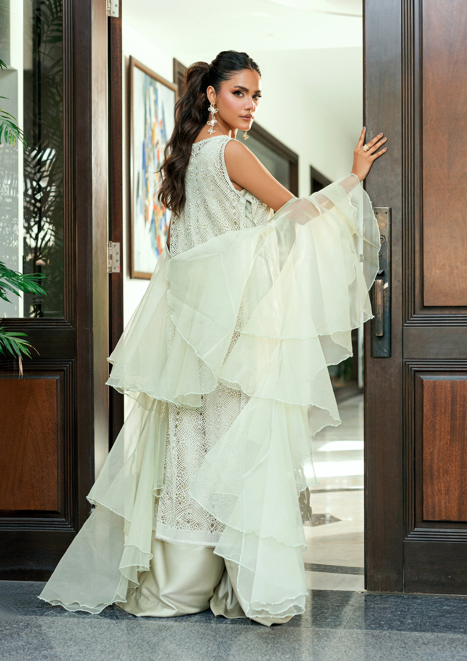 The look is completed with fluid wide-leg trousers and a ruffled organza dupatta that brings softness and drama in equal measure. Every detail of Mint Lace is thoughtfully composed—where classic femininity meets modern finesse.