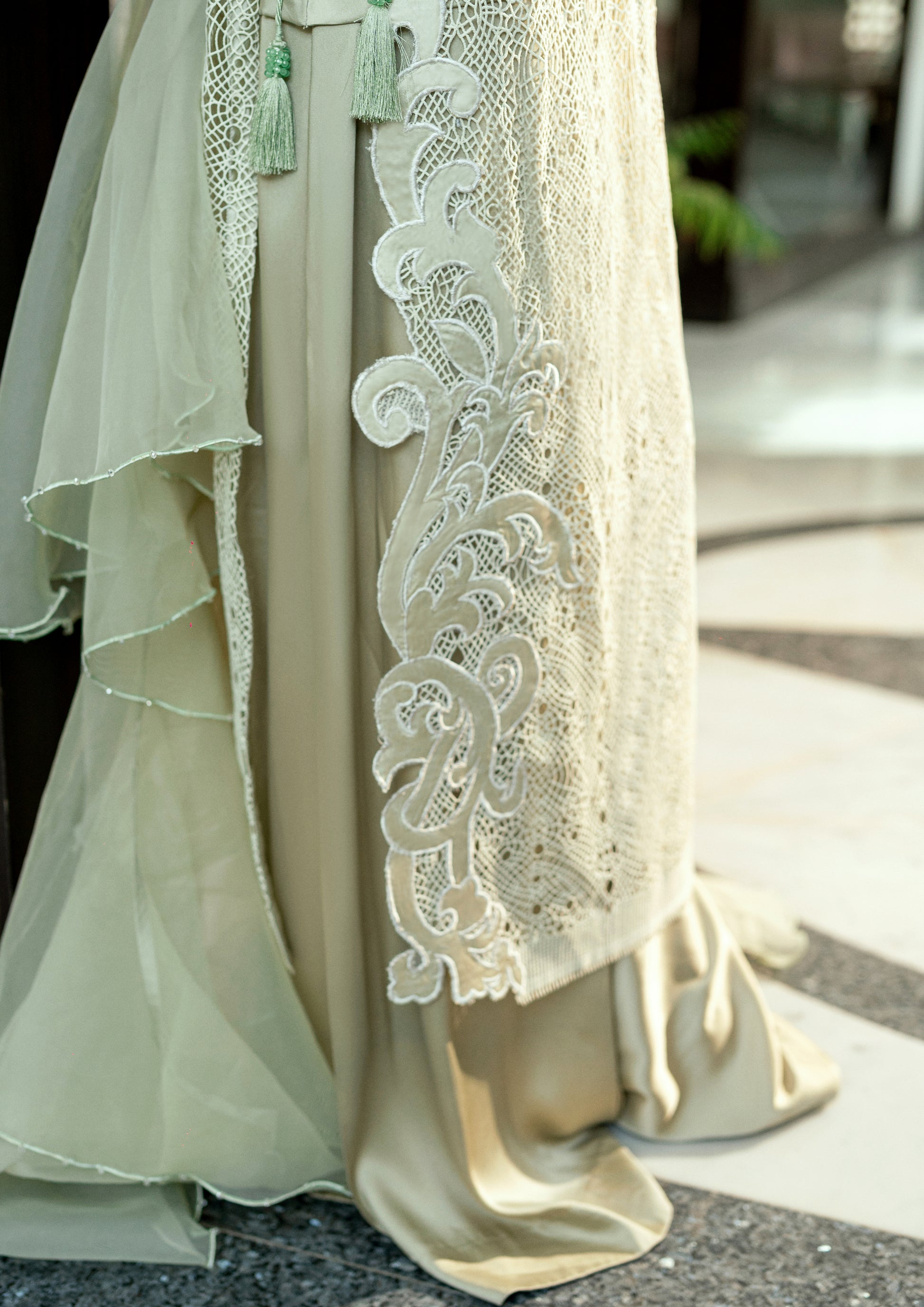 Light as air and intricately detailed, Mint Lace is a 3-piece ensemble in a soothing light sage tone. The shirt is crafted from delicate lace fabric, layered with schiffly embroidery and elevated by satin silk applique border runs along the slits, adding textural contrast and refined structure.