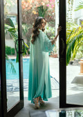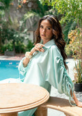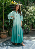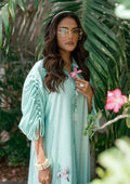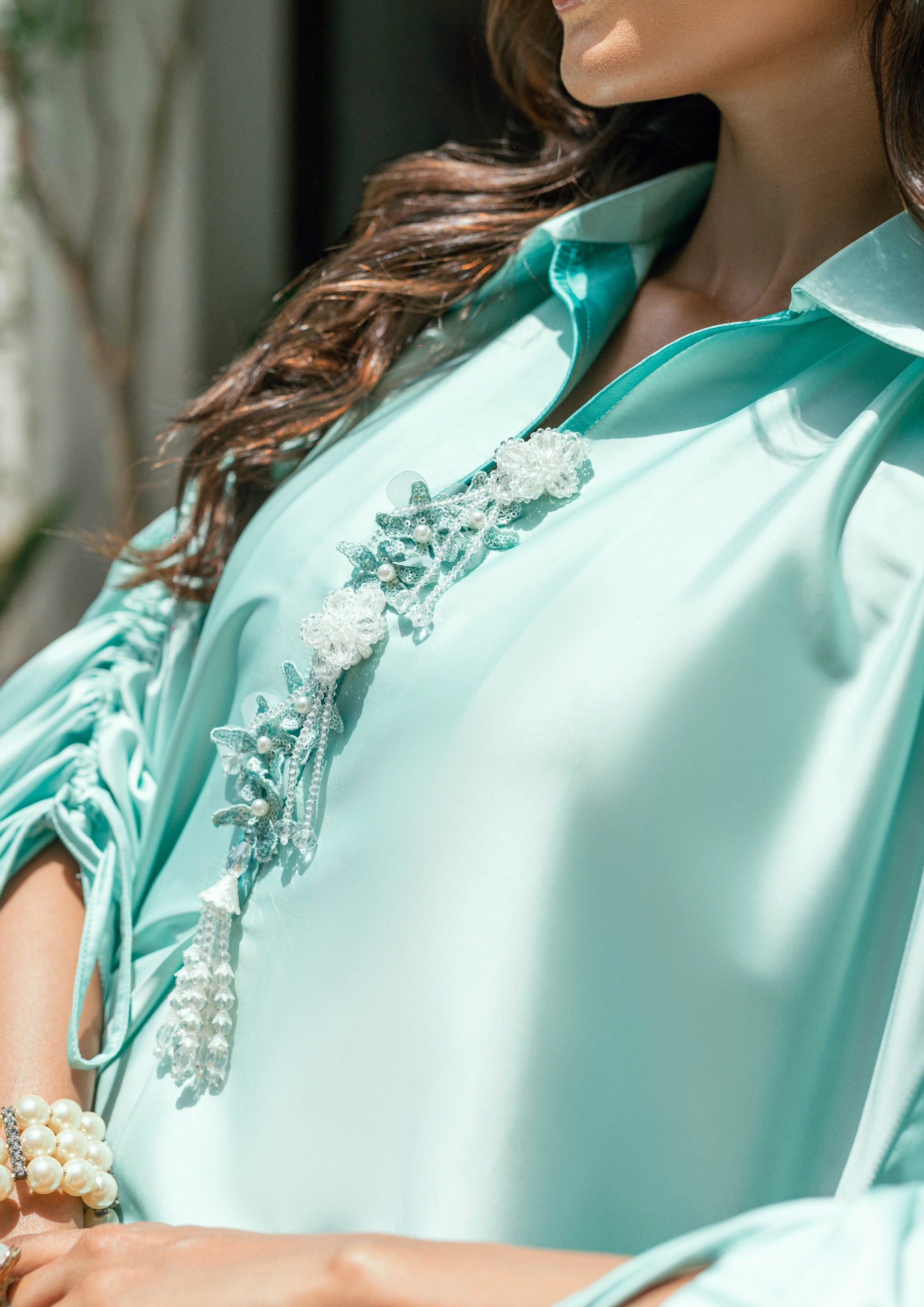 A poetic silk tunic that captures the quiet elegance of a seascape at dawn. This single-piece ensemble flows in a soft gradation from aqua to tranquil turquoise, offering a serene play of tones. The relaxed silhouette is anchored by a bold, oversized shirt collar and a front placket adorned with delicate crystal embellishments, catching the light with every movement elevated with voluminous balloon sleeves, finished with adjustable tie strings. At the hem, delicate hand-embellished birds add a touch of artisanal charm, making this piece a wearable canvas of calm and craft.