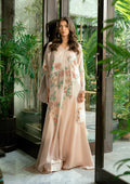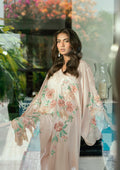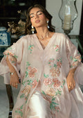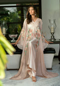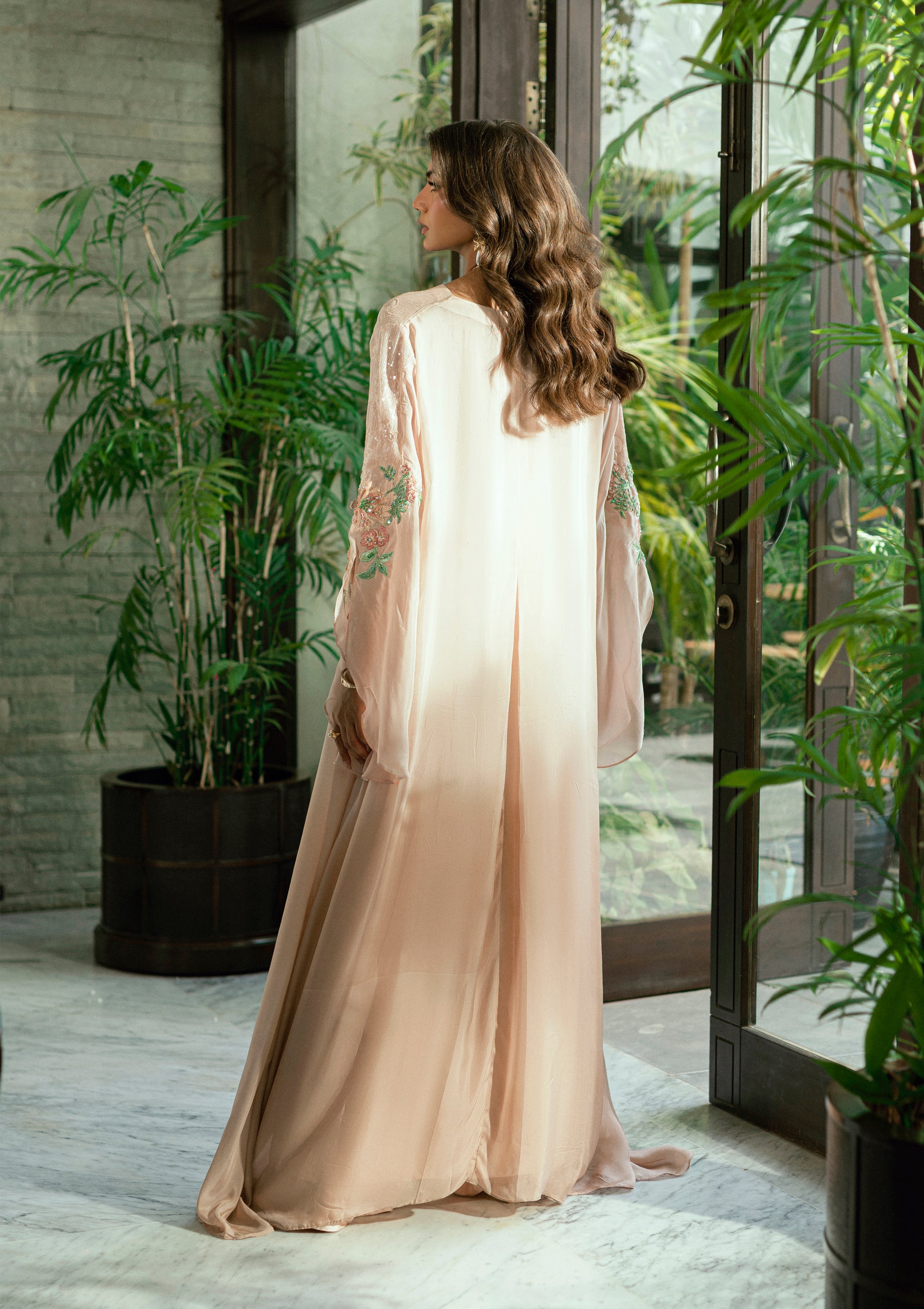 An ode to feminine fluidity, Rose Dusk is a striking three-piece ensemble that blends structure with softness. The look centers around a flowy, front-open cape dyed in a dreamy gradation from coral pink to vintage mauve. Bell sleeves add drama and grace, while the cape itself is brought to life with delicate floral embroidery, adorned with crystals, sequins, and beads—creating a subtle shimmer with every step.