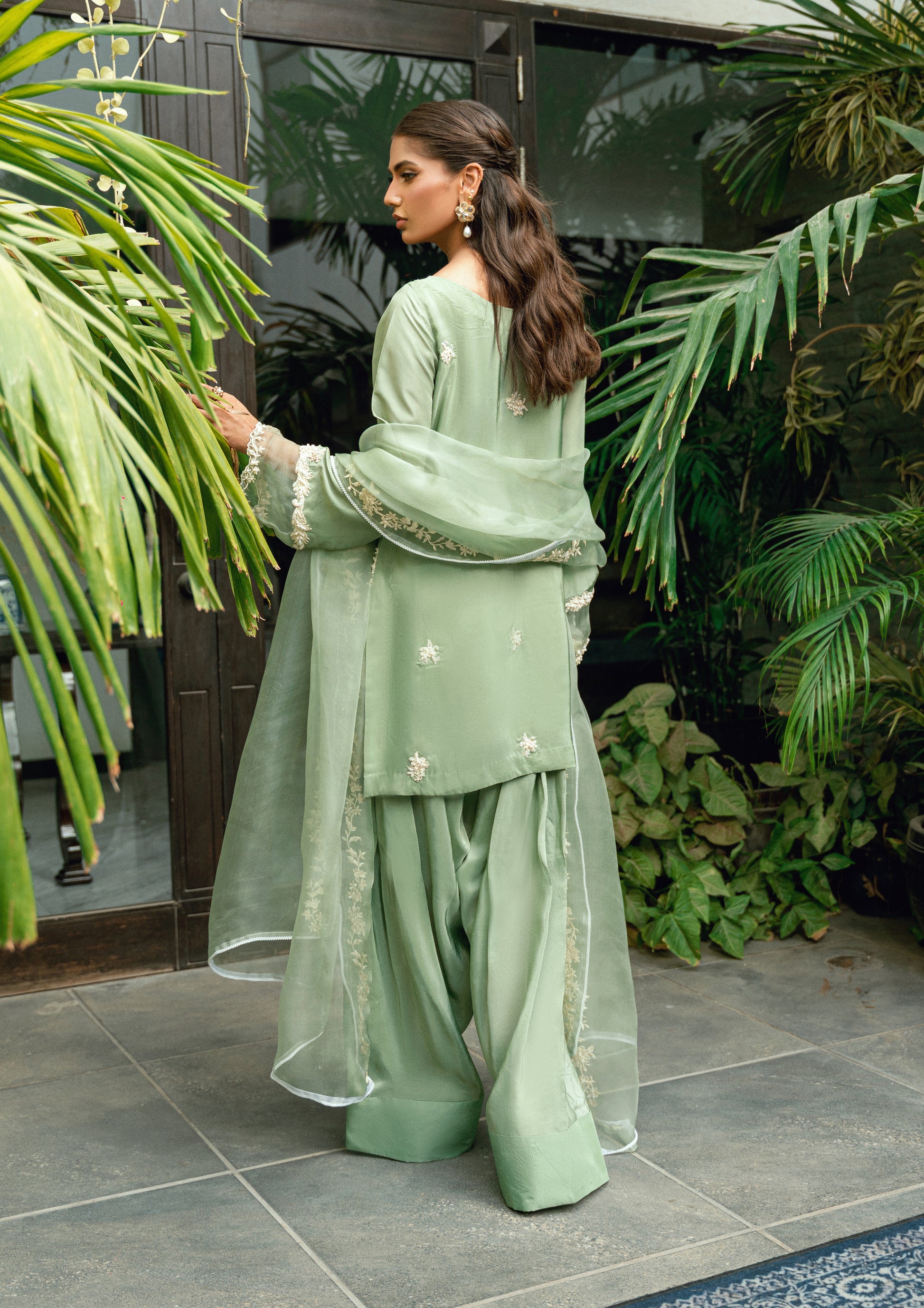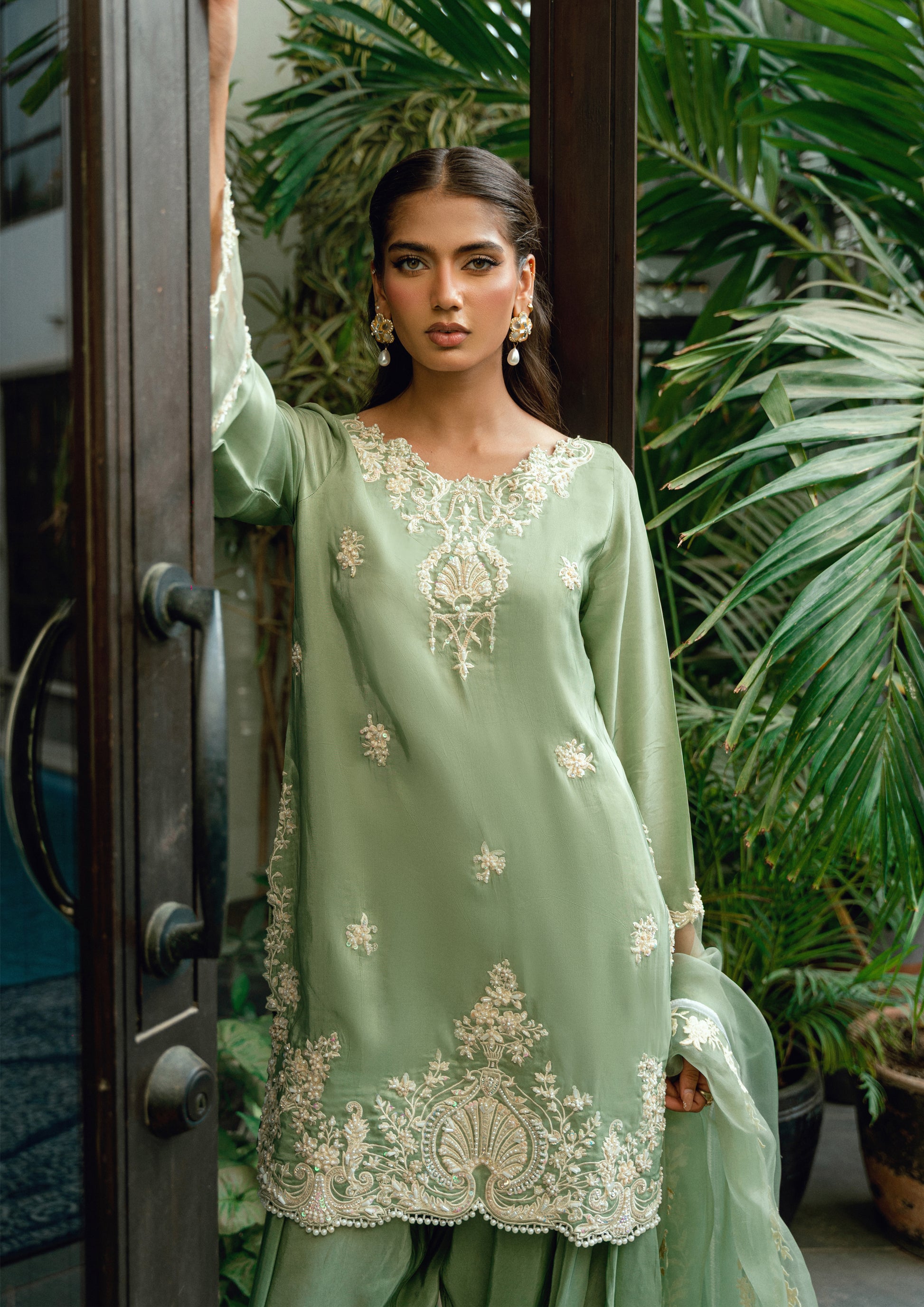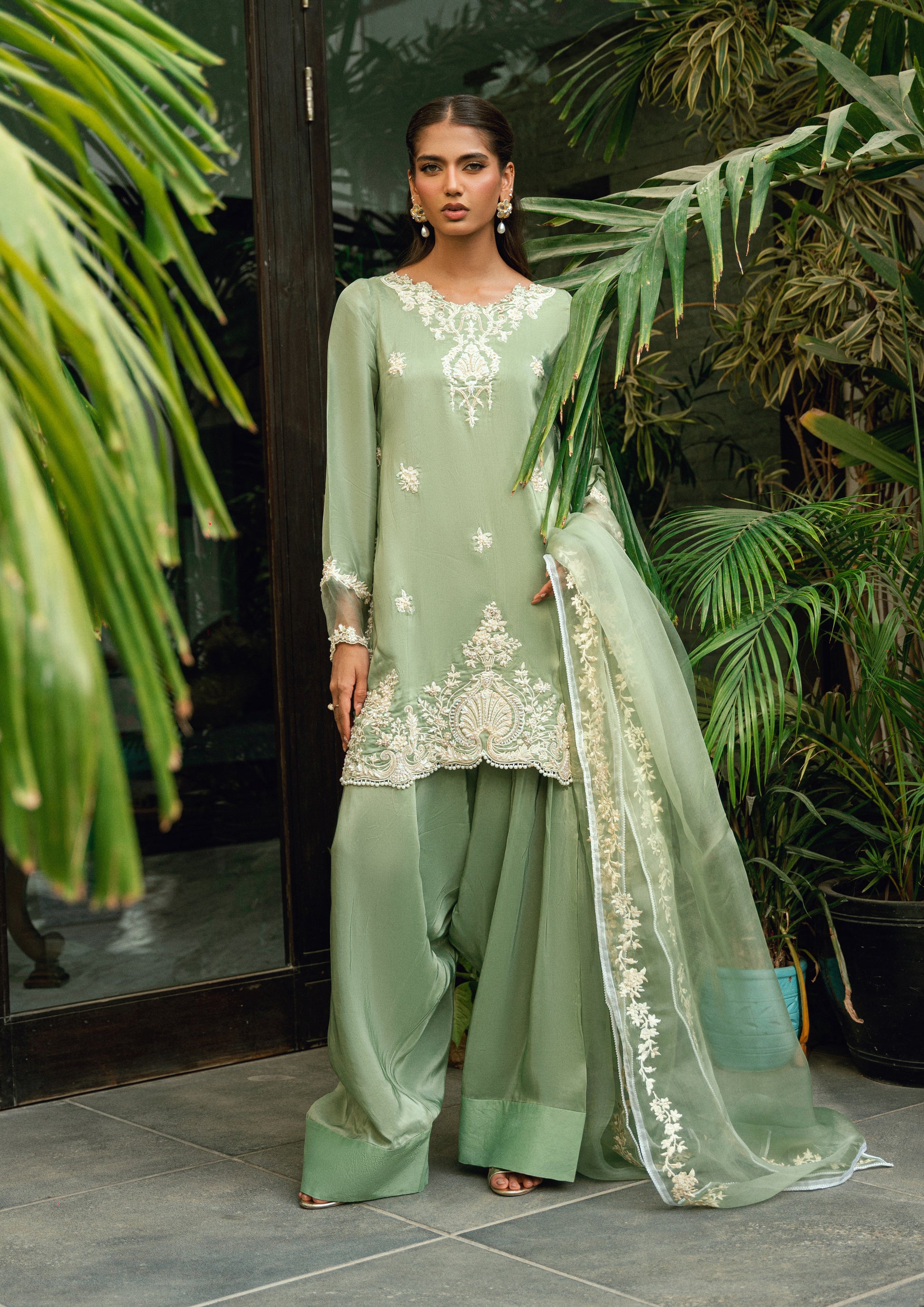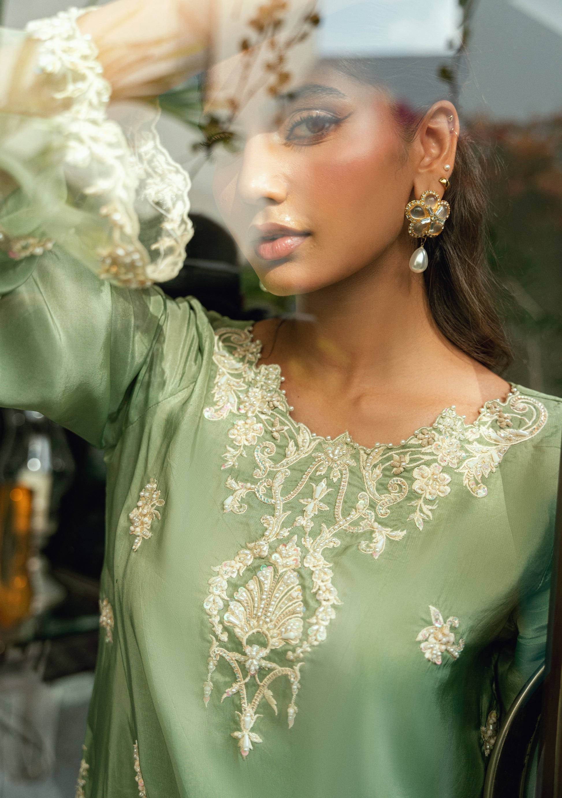 Graceful and rooted in timeless charm, sage mist is a 3-piece ensemble rendered in a calming sage green hue. The short-length shirt features Victorian-inspired embroidery—a delicate tapestry of motifs meticulously embellished with crystals, pearls, and sequins, bringing a regal luminosity to the design.