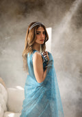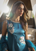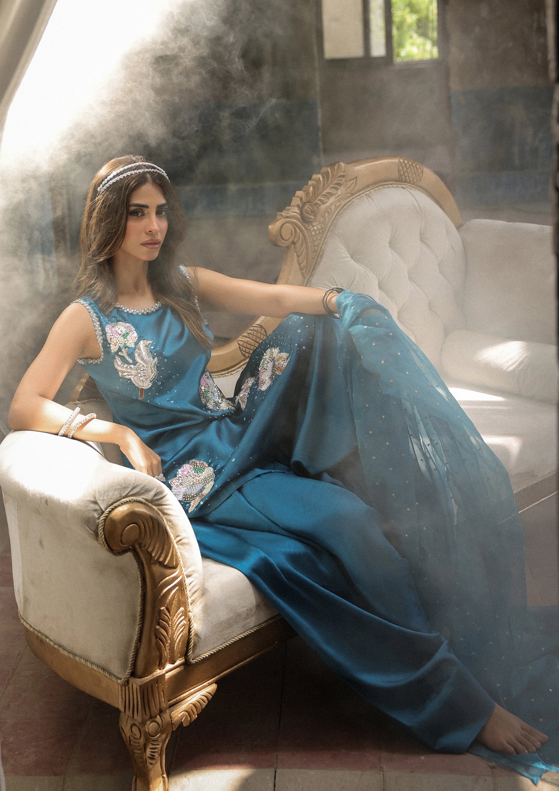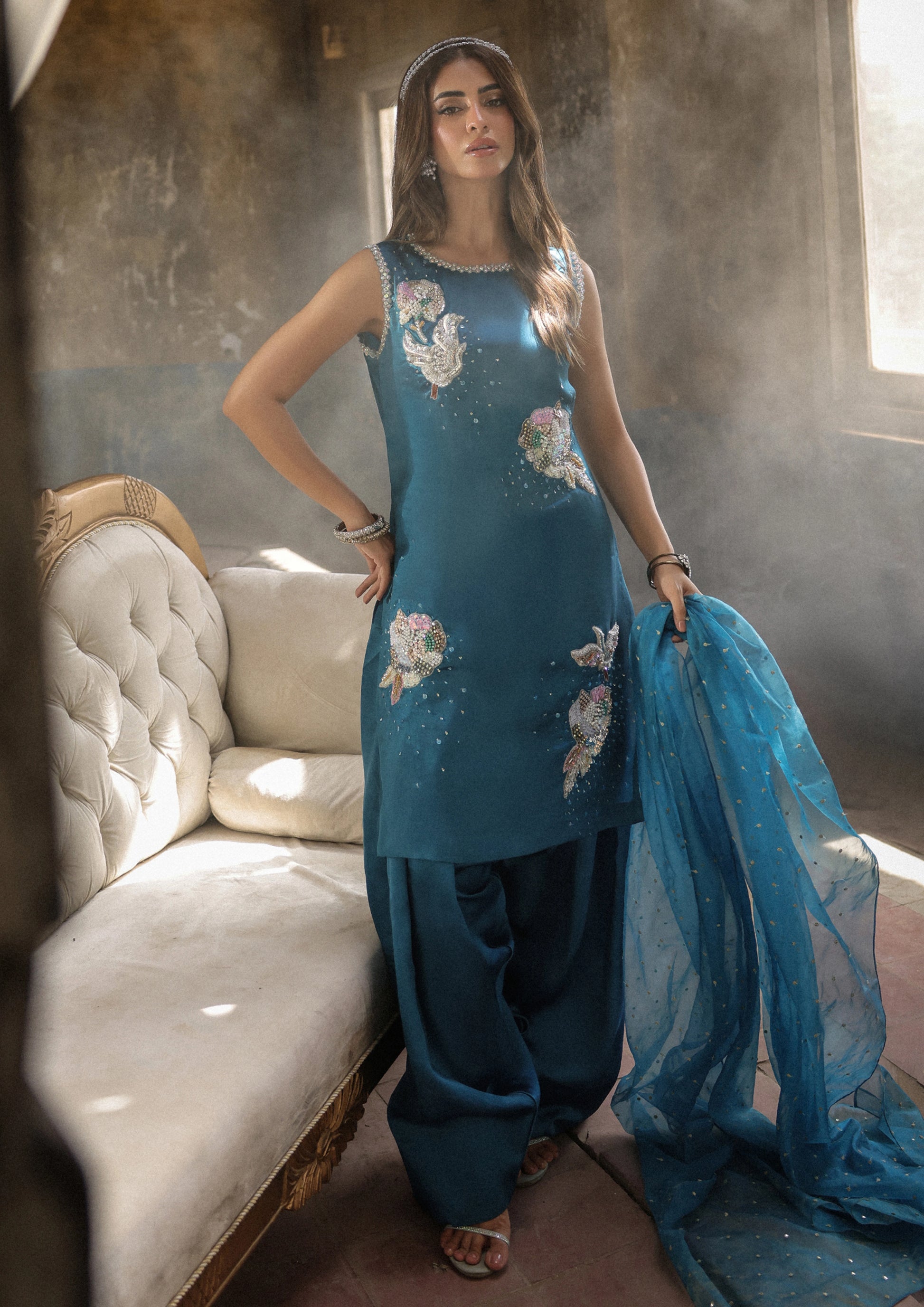 This 3-piece traditional silhouette features a short-length shirt paired with a graceful farshi shalwar and an embroidered organza dupatta. The outfit is embellished with crystals, studs, diamonties, and beads, adding depth and shimmer to the design. Completed with the sheer elegance of an organza dupatta, this ensemble beautifully balances tradition with contemporary detailing.