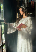 A poetic statement in warm grey, Smokewood Grace is a long-length tunic tailored in luxurious butter silk, known for its soft sheen and elegant fall. The shirt is intricately detailed with Schiffli embroidery, further enhanced by delicate hand embellishments. The neckline sparkles with a generous scattering of crystals and sequins, lending a touch of refined glamour.
