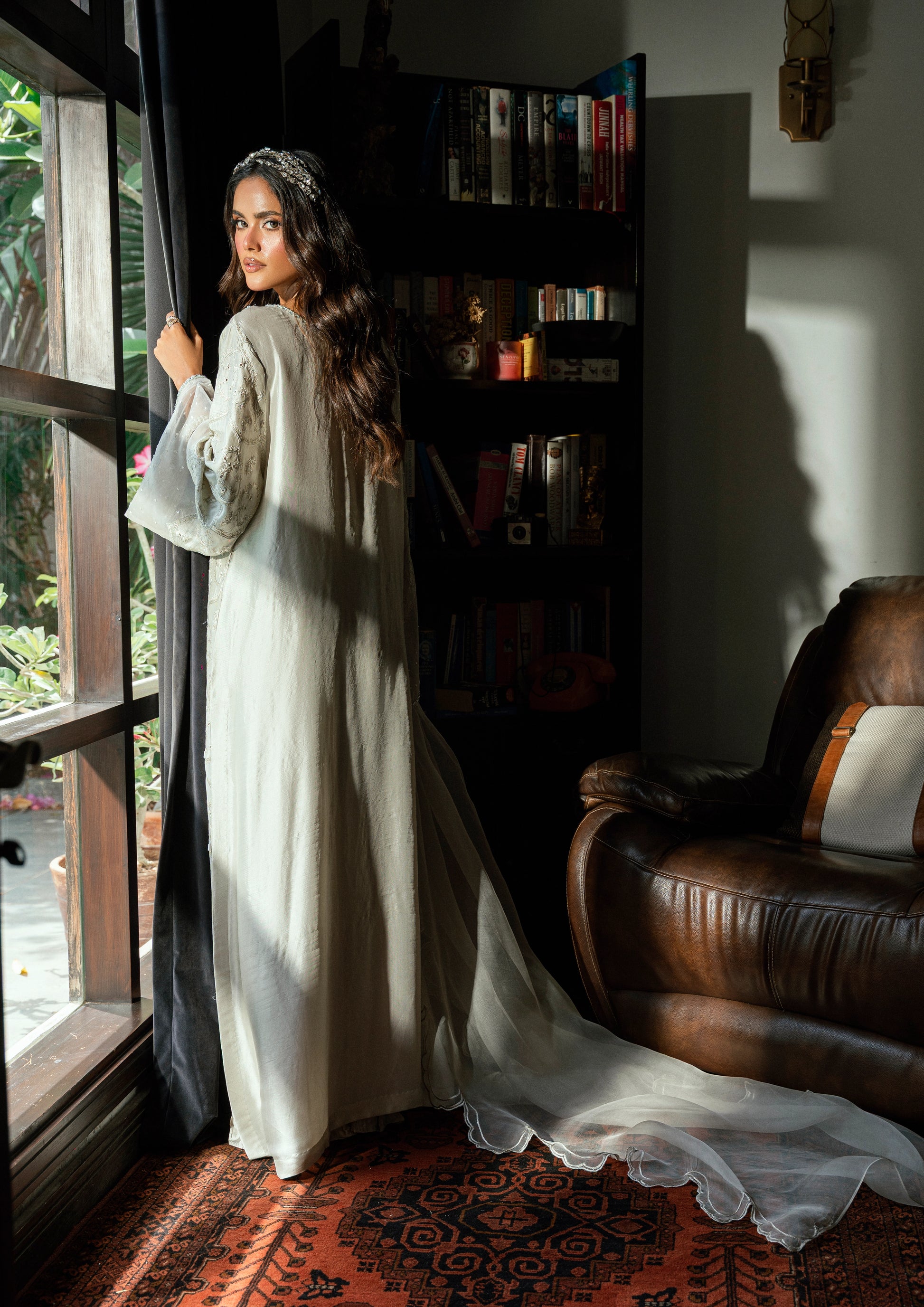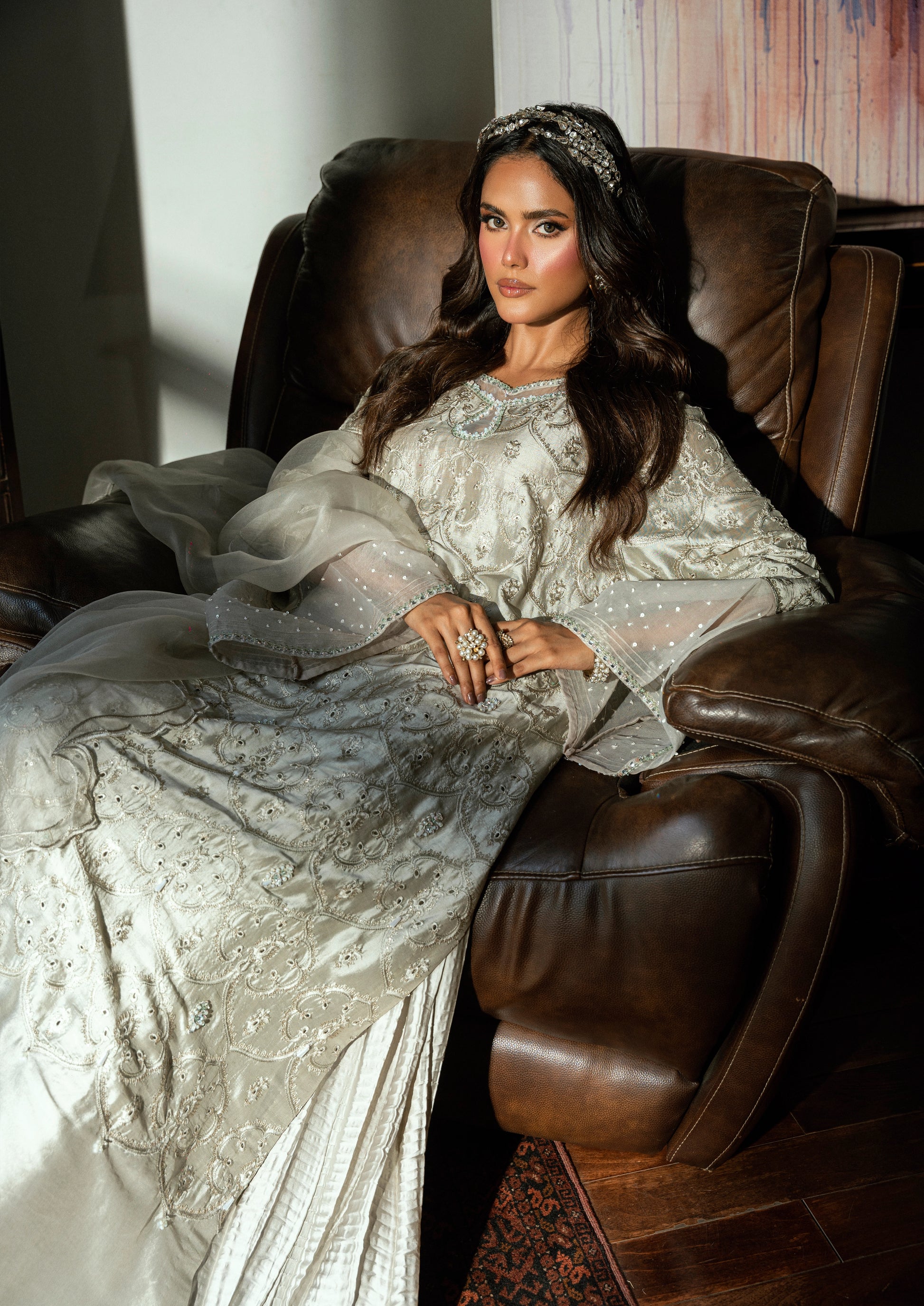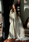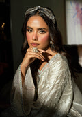 Structured bell sleeves add drama and movement, framed with an organza border—is hand-embellished with sequins and crystals for a luminous finish. Paired with crushed satin silk trousers that bring soft texture and balance, the look is completed with a bold scalloped pure organza dupatta, richly embroidered to echo the craftsmanship of the main piece.