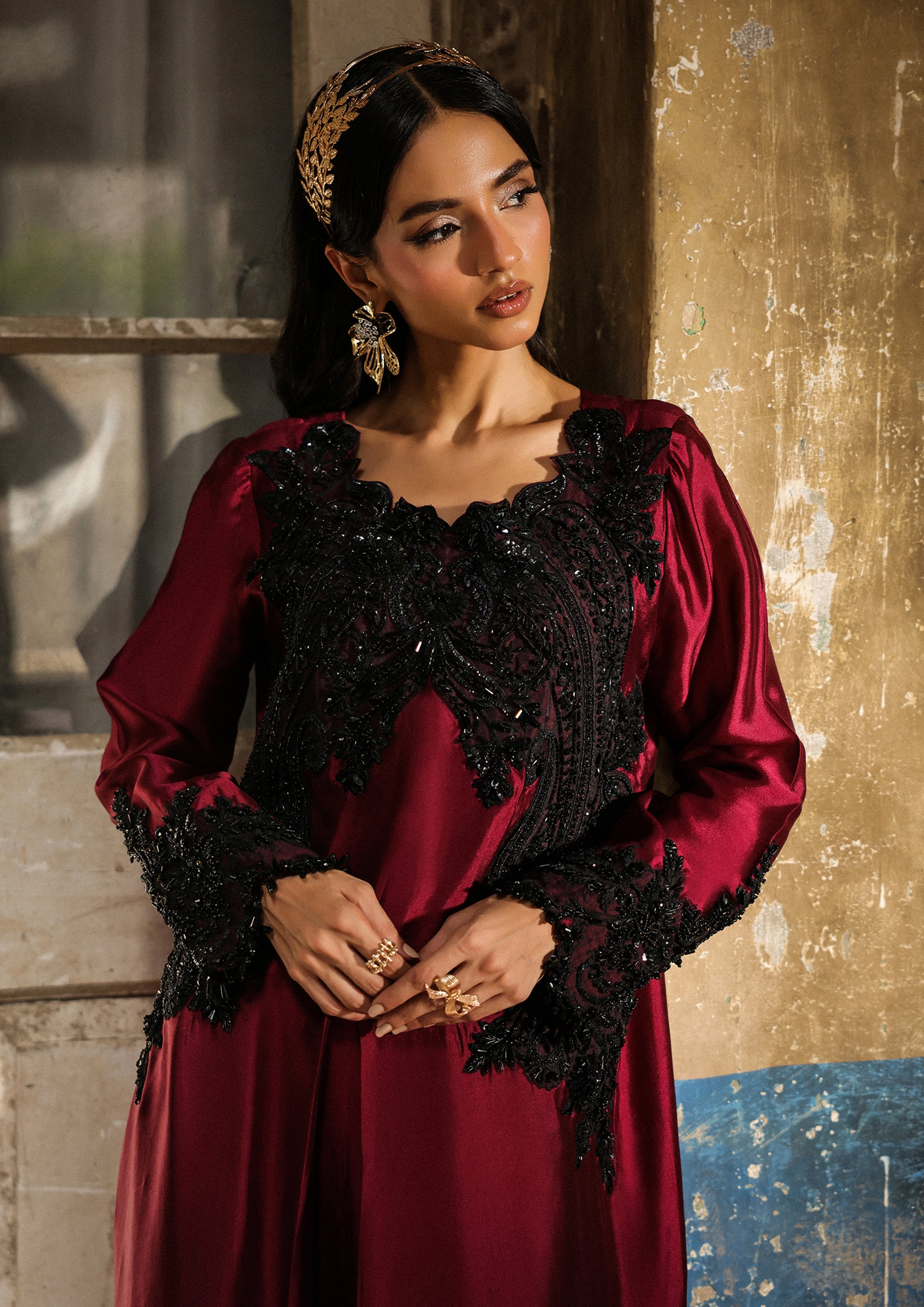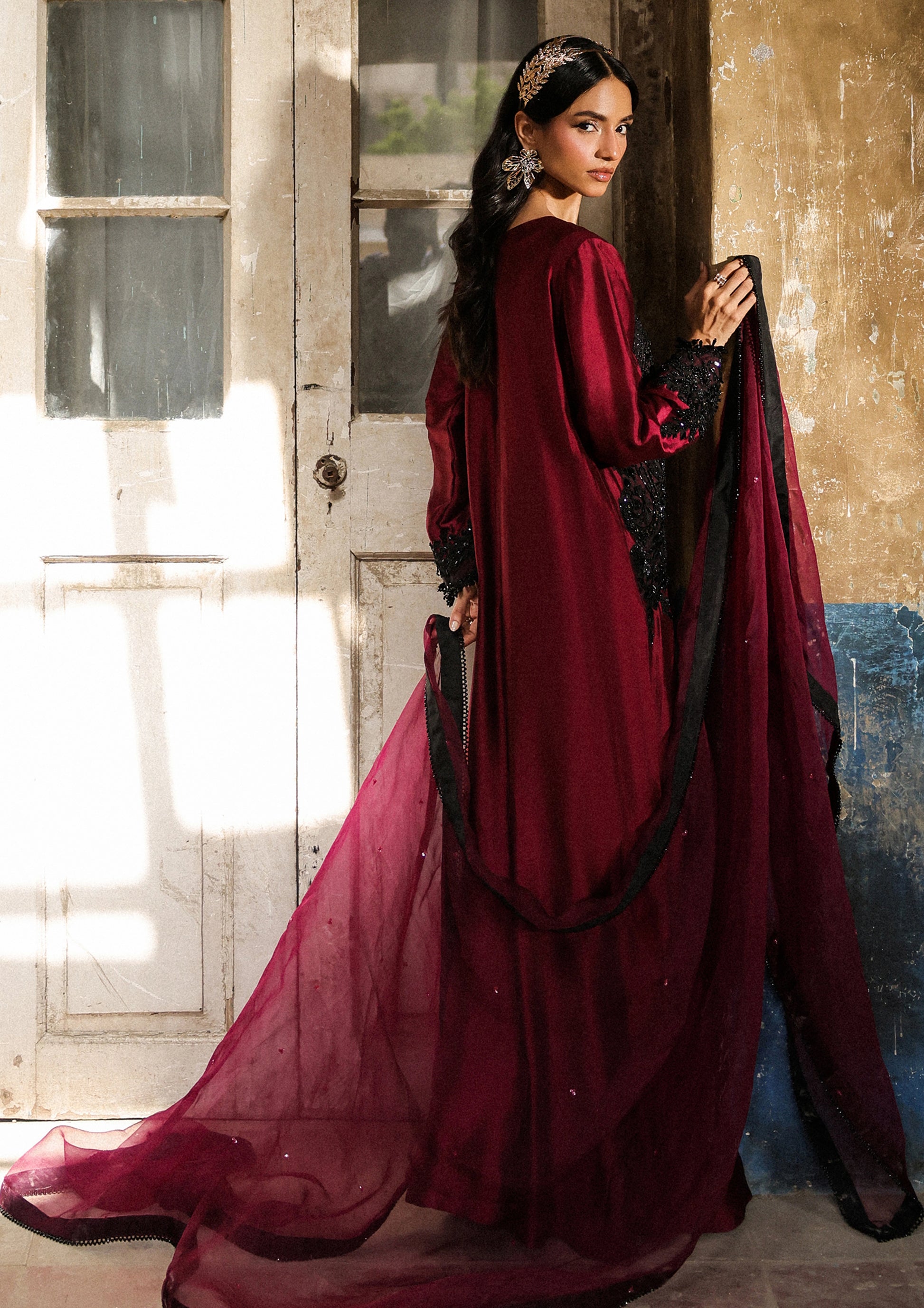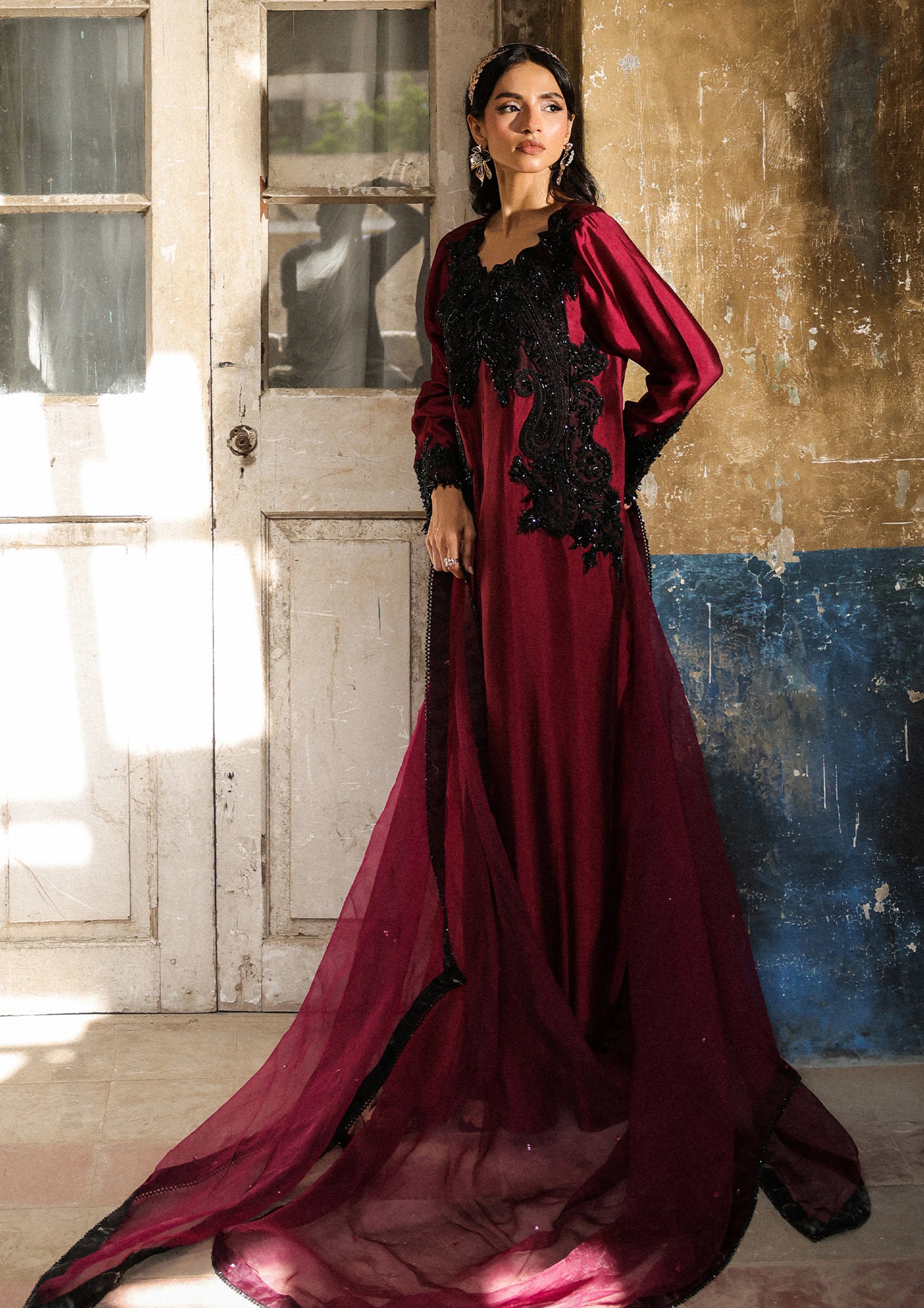 A refined symphony of flow and craft — this long, graceful shirt features front and back box pleats, embellished with Kashmiri-inspired embroidery, glistening black crystals, and delicate studs. Paired with sleek cigarette pants and an embellished organza dupatta, the ensemble embodies timeless sophistication with a modern spirit.
