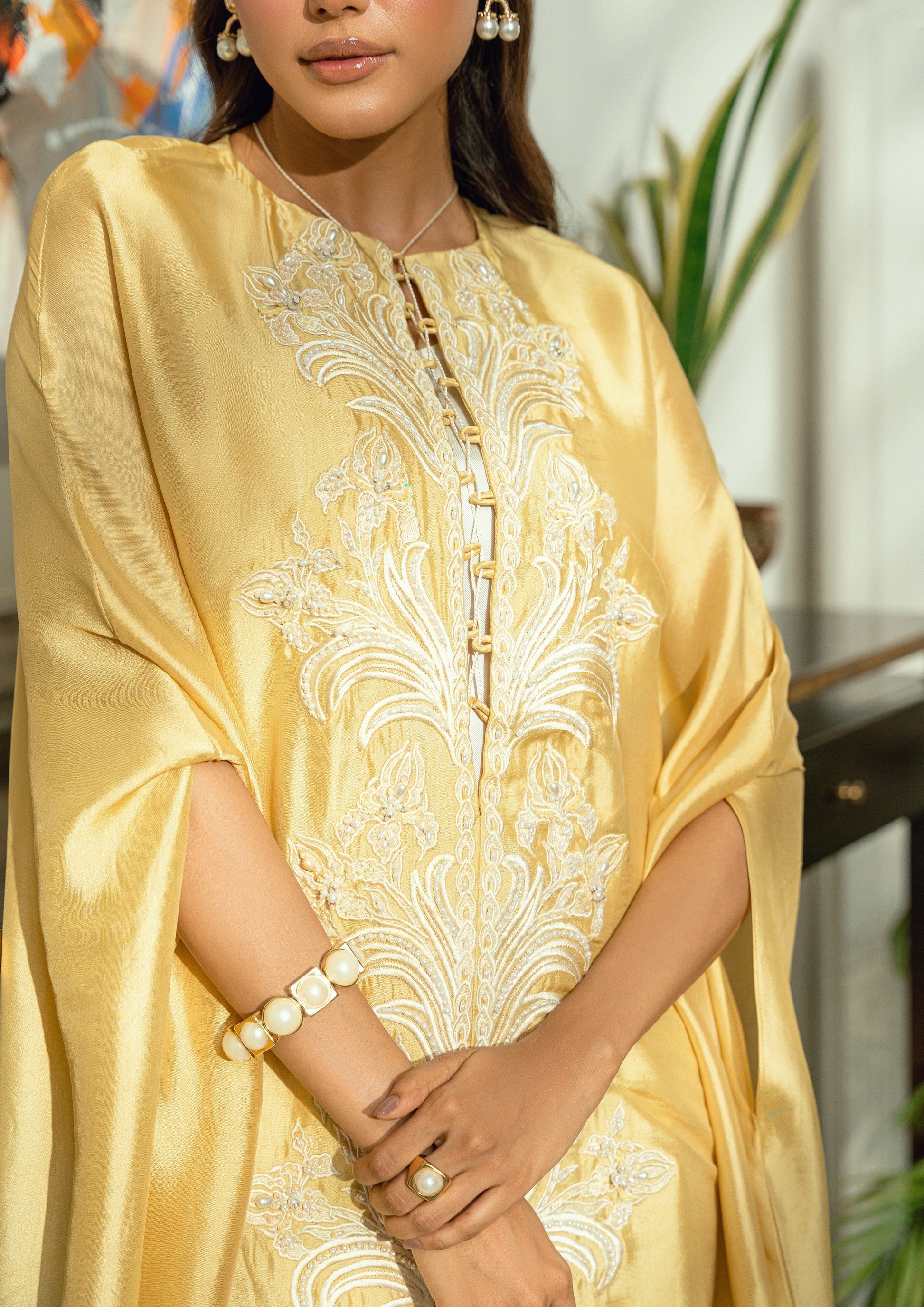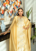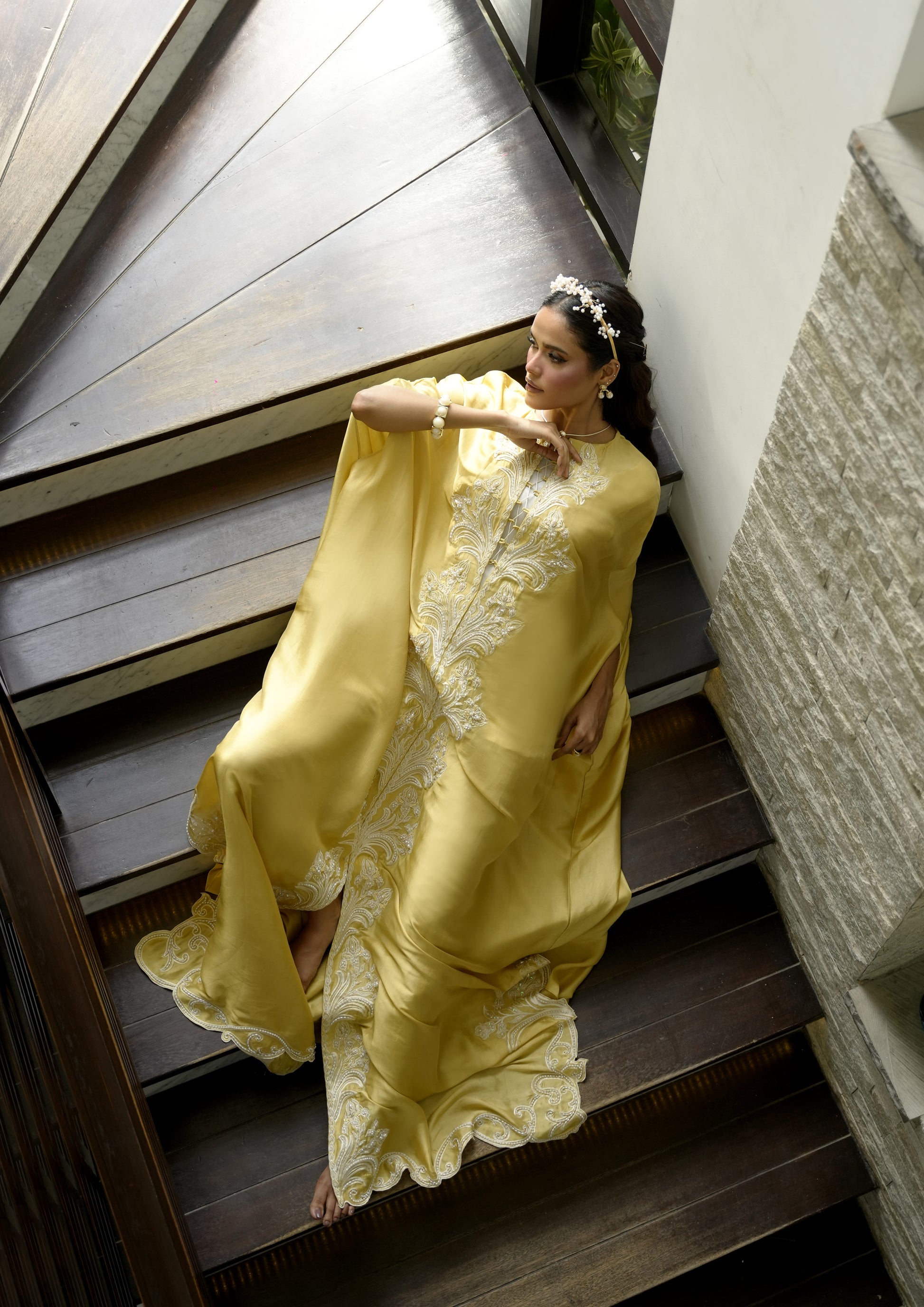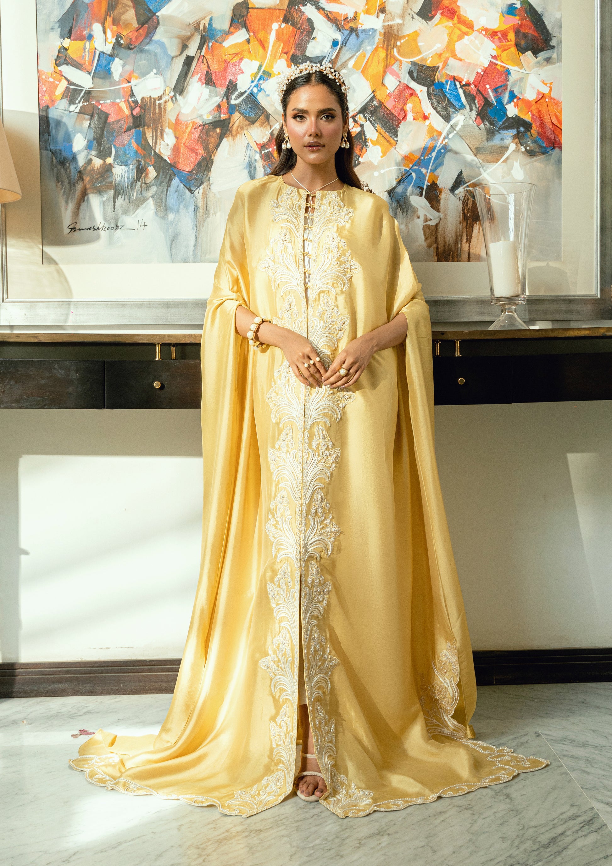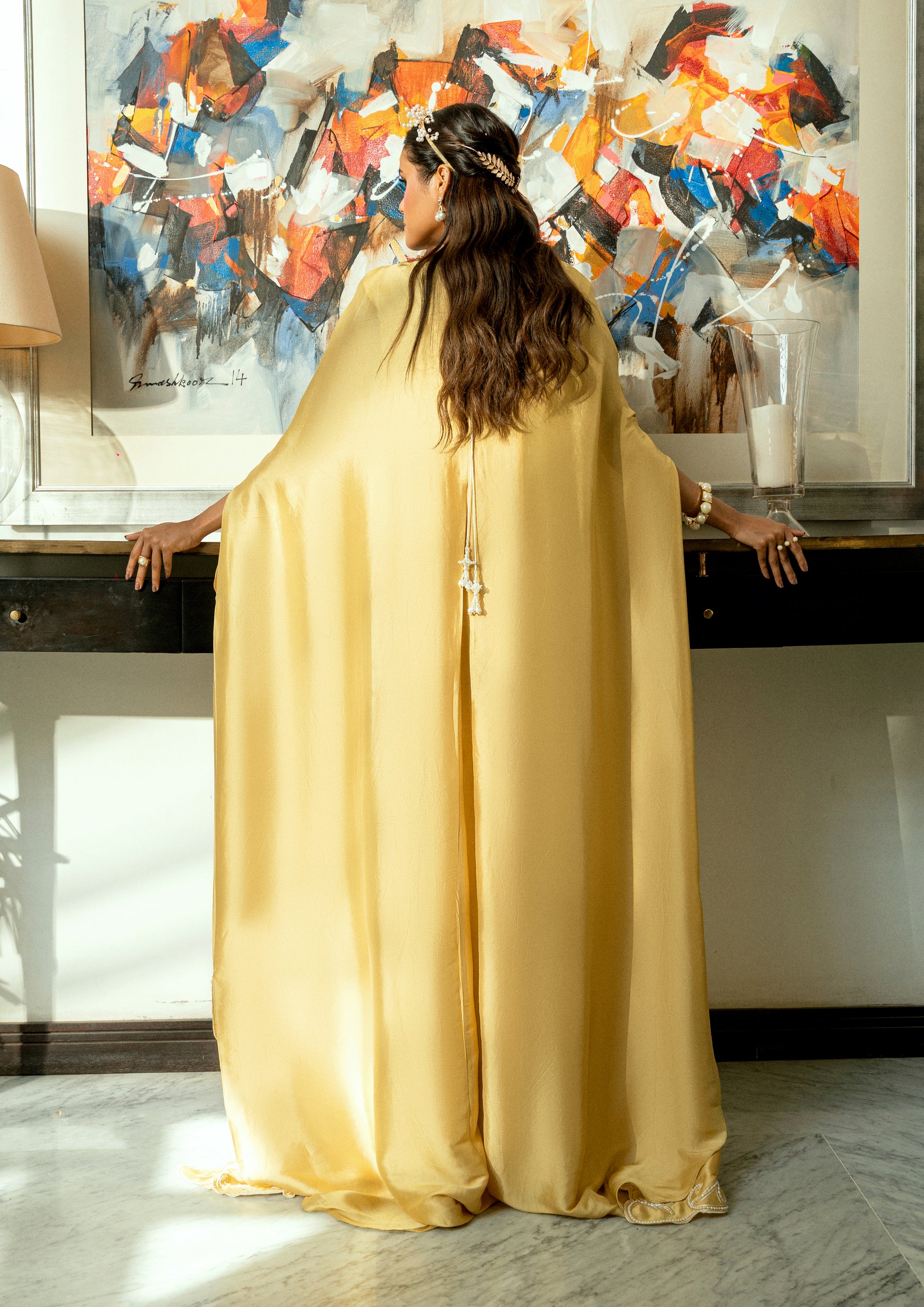 Radiating in a bold mustard hue and crafted from lustrous butter silk, Sun Relic channels the divine aura of a modern-day goddess. This front-open ensemble is crowned with a grand butterfly-style cape—dramatic yet graceful, designed to drape like wings in motion.