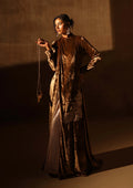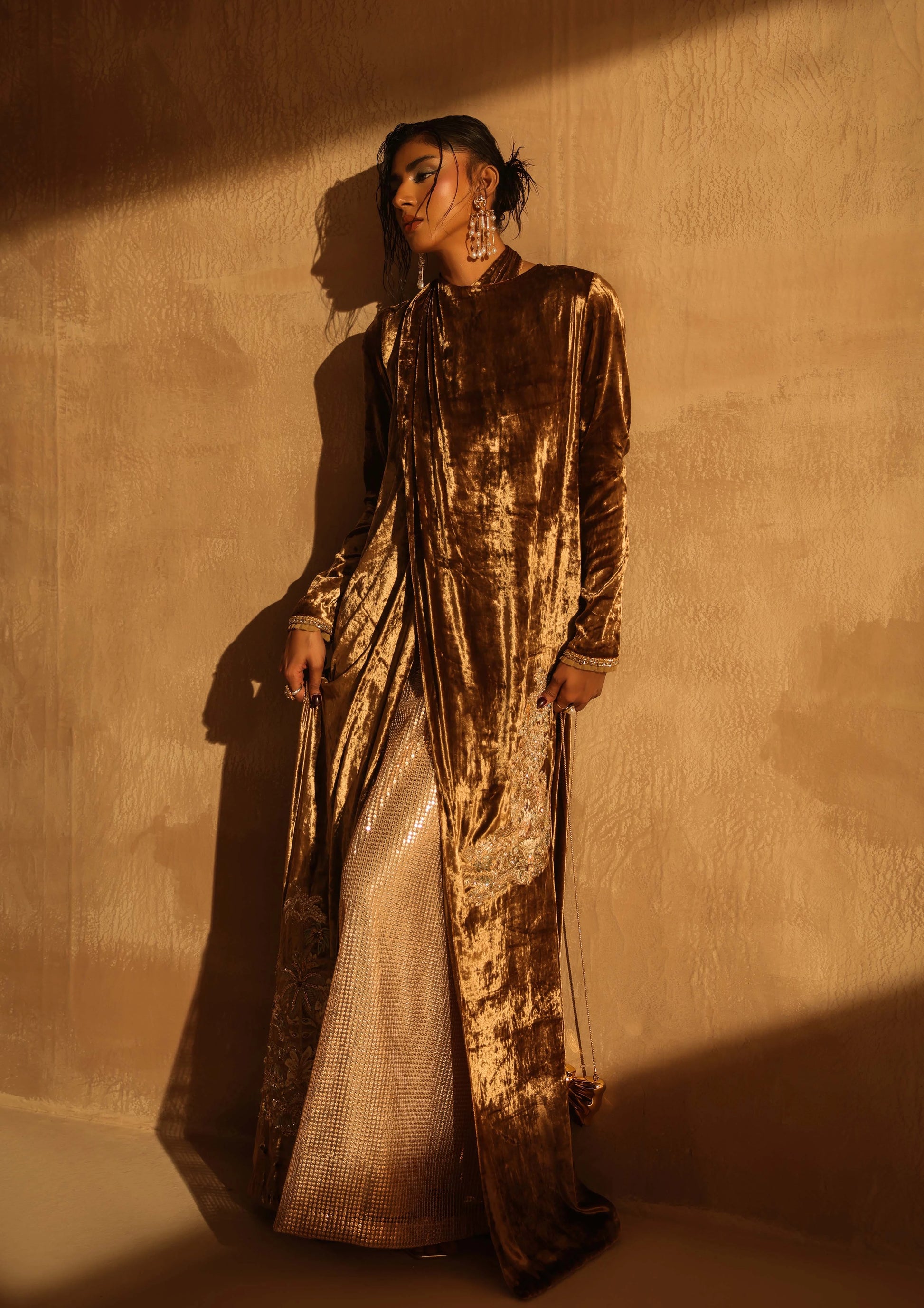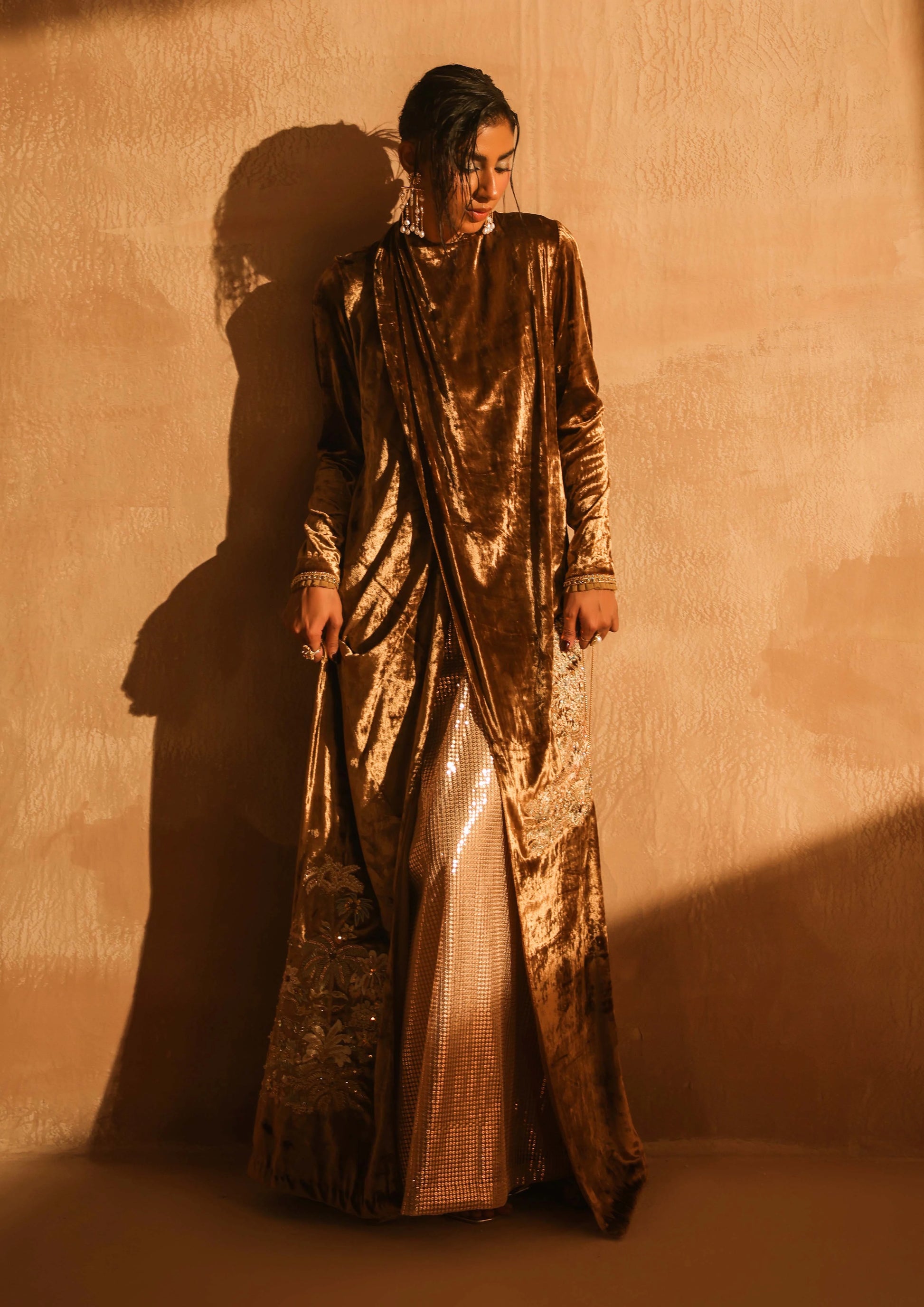 An embodiment of refined opulence, this beige-toned ensemble is crafted as a dramatic double-layer statement look. The inner dress shimmers with delicate sequins, forming a luminous base that glides effortlessly with every step. Over it falls a floor-touch beige velvet cape, adding depth, movement, and regal presence to the silhouette.